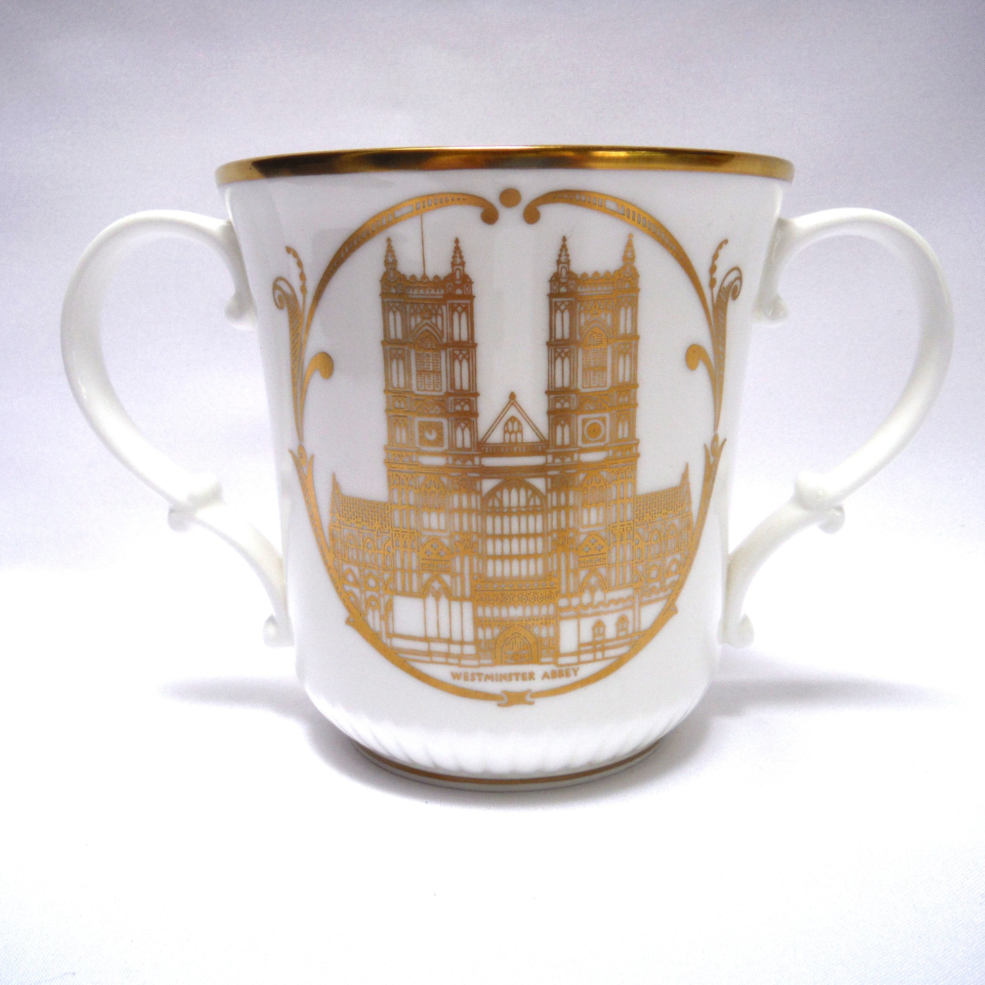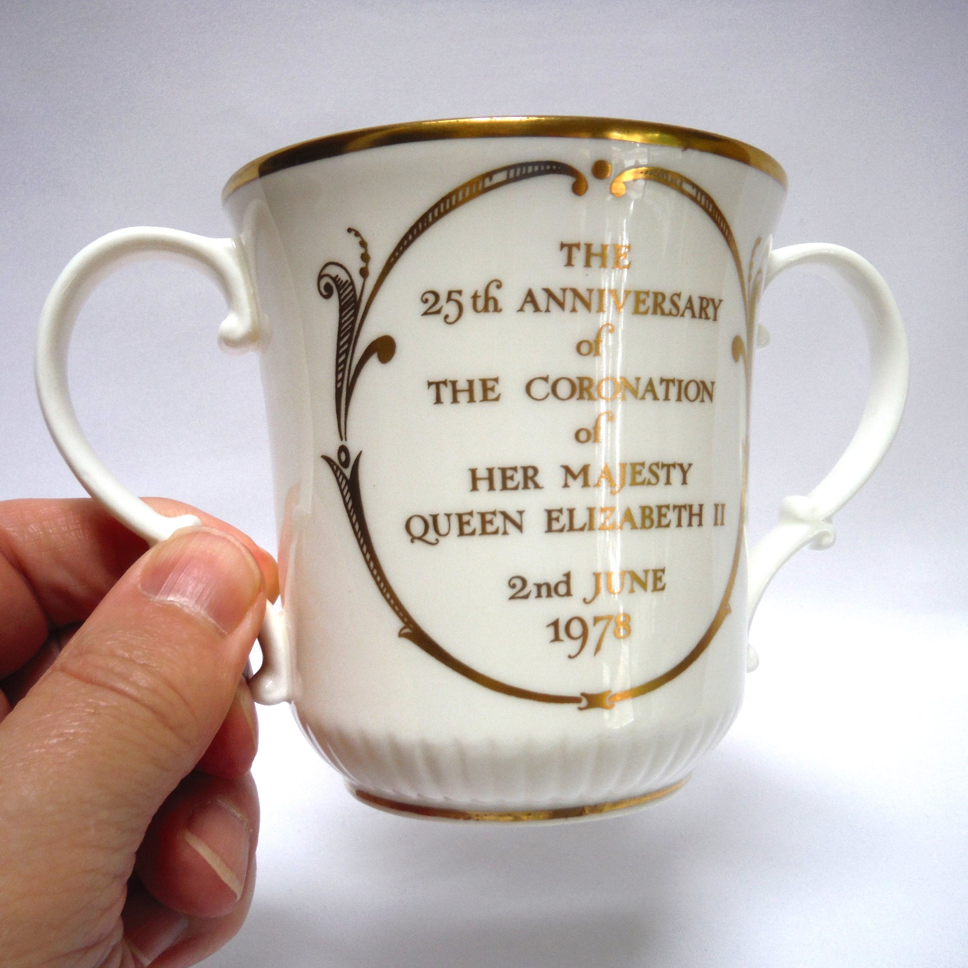 QUEEN ELIZABETH II LOVING CUP: 25th Anniversary of Her Majesties Coronation 1953-1978. This is a Royal Doulton Loving Cup that was specially made for Queen Elizabeth II’s 25th Coronation Anniversary (1978). A commemorative cup celebrating the Queen’s milestone. Beautiful two handled cup with stunning gold printing and trim, in excellent condition.