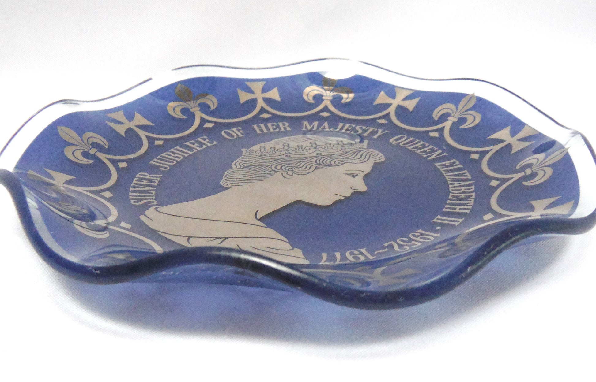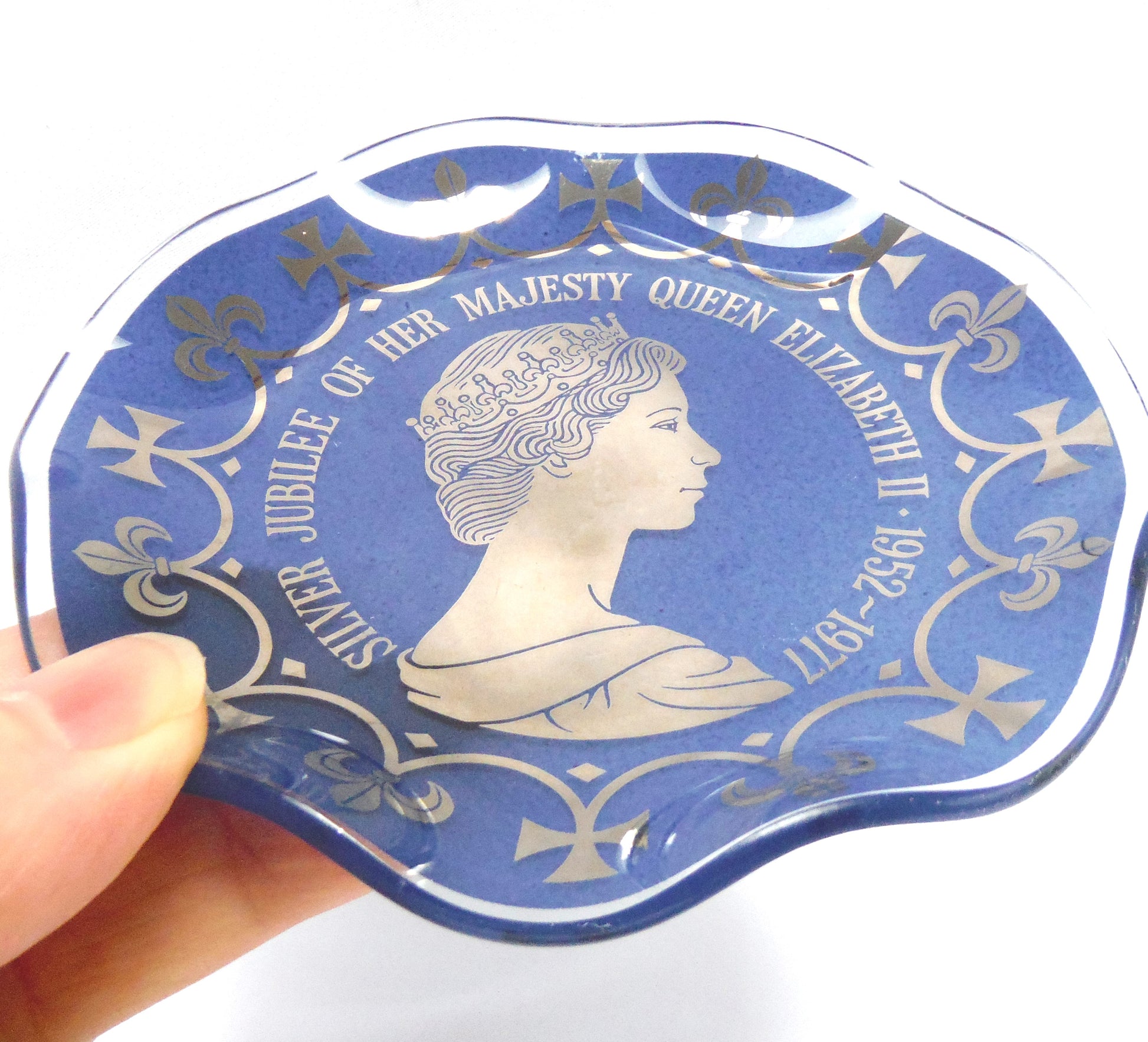 QUEEN ELIZABETH II SILVER JUBILEE: Round Glass Trinket Tray, 1977. Her Majesty Queen Elizabeth II looks so young in this profile image on this 1977 Silver Jubilee Souvenir. The image and writing appears silver, against a background of dark blue. Sides of the glass tray are a 70's style wavy scalloped design. MINT Condition. Made in England.ย