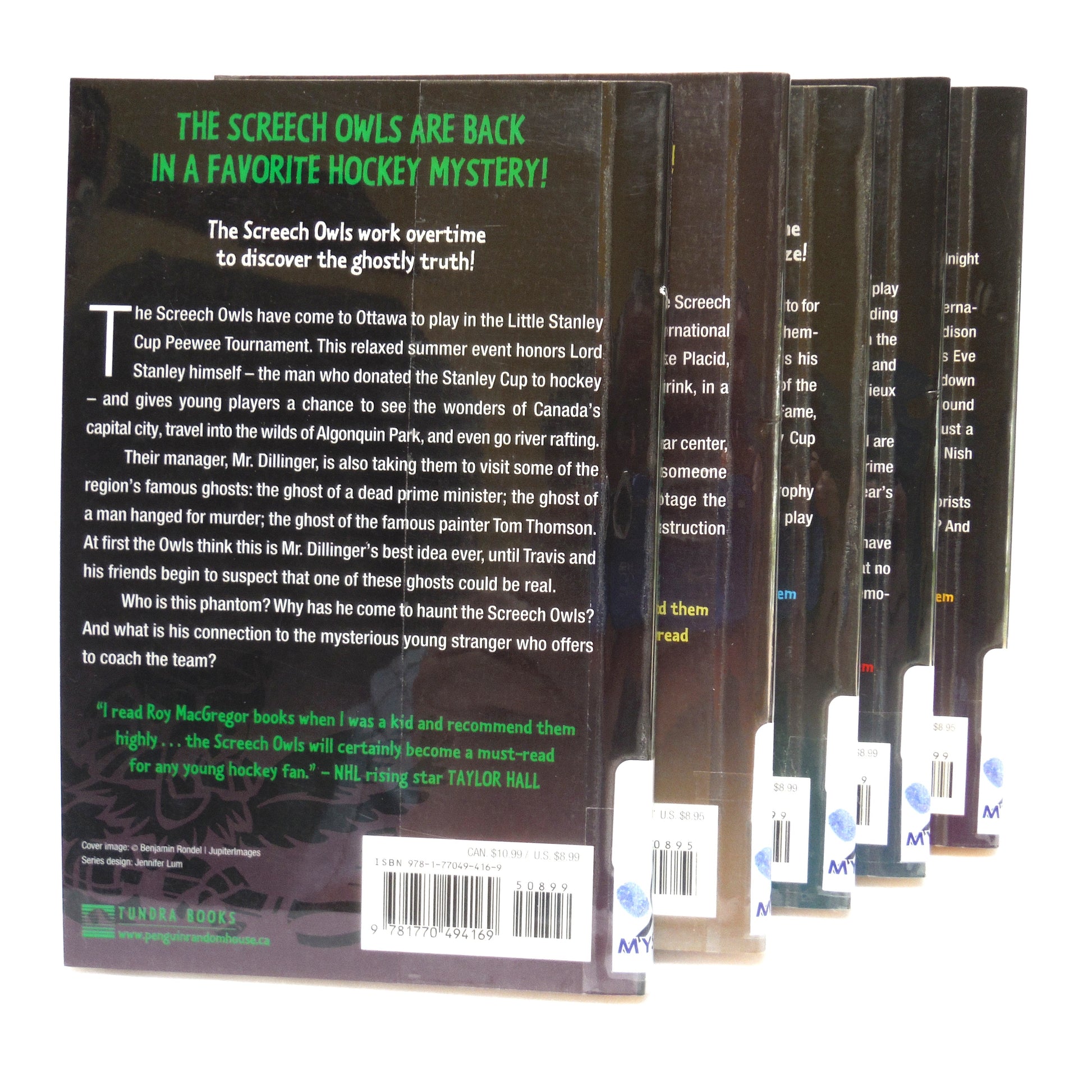"This is a unique set because each of these five books have been lovingly covered in a heavy acrylic plastic, and also labelled on the cover and spine, not much mystery as only libraries do something to this extent. So, why are these books no longer in a library, and why is their condition BRAND NEW? These books have never been opened. Anyways, here's your one-time opportuntity to own a very unique, and well-protected Set of 5 Roy MacGregor and The Screech Owls mystery books, good luck eh!" -Paul G.