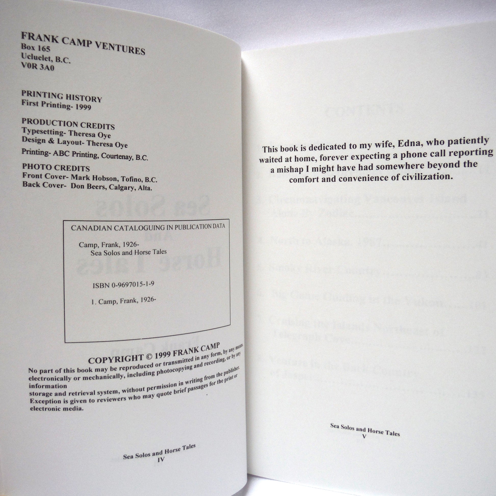 Author: Frank Camp. Published by Frank Camp Ventures, Ucluelet, BC., 1999, 1st Edition. Printed in Canada. Like New Condition SOFTCOVER Book. Clean inside, tight spine. Size: 8.25 x 5.25 inch, 157 pages.