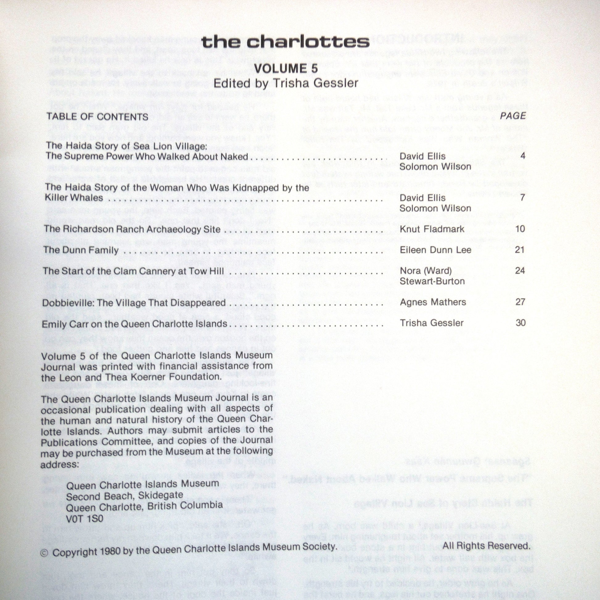 THE CHARLOTTES Volume 5, by The Queen Charlotte Islands Museum Society, Volume 5, is a wonderful collection of stories that showcased the 'progress' the european settlers were making living in the Queen Charlotte Islands, now proudly named Haida Gwaii.