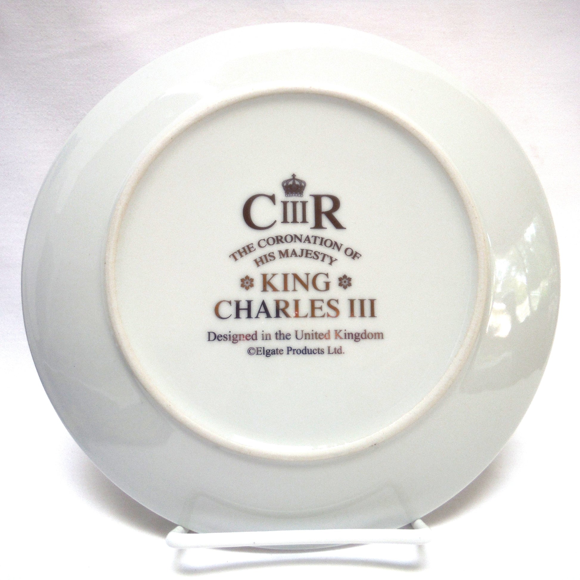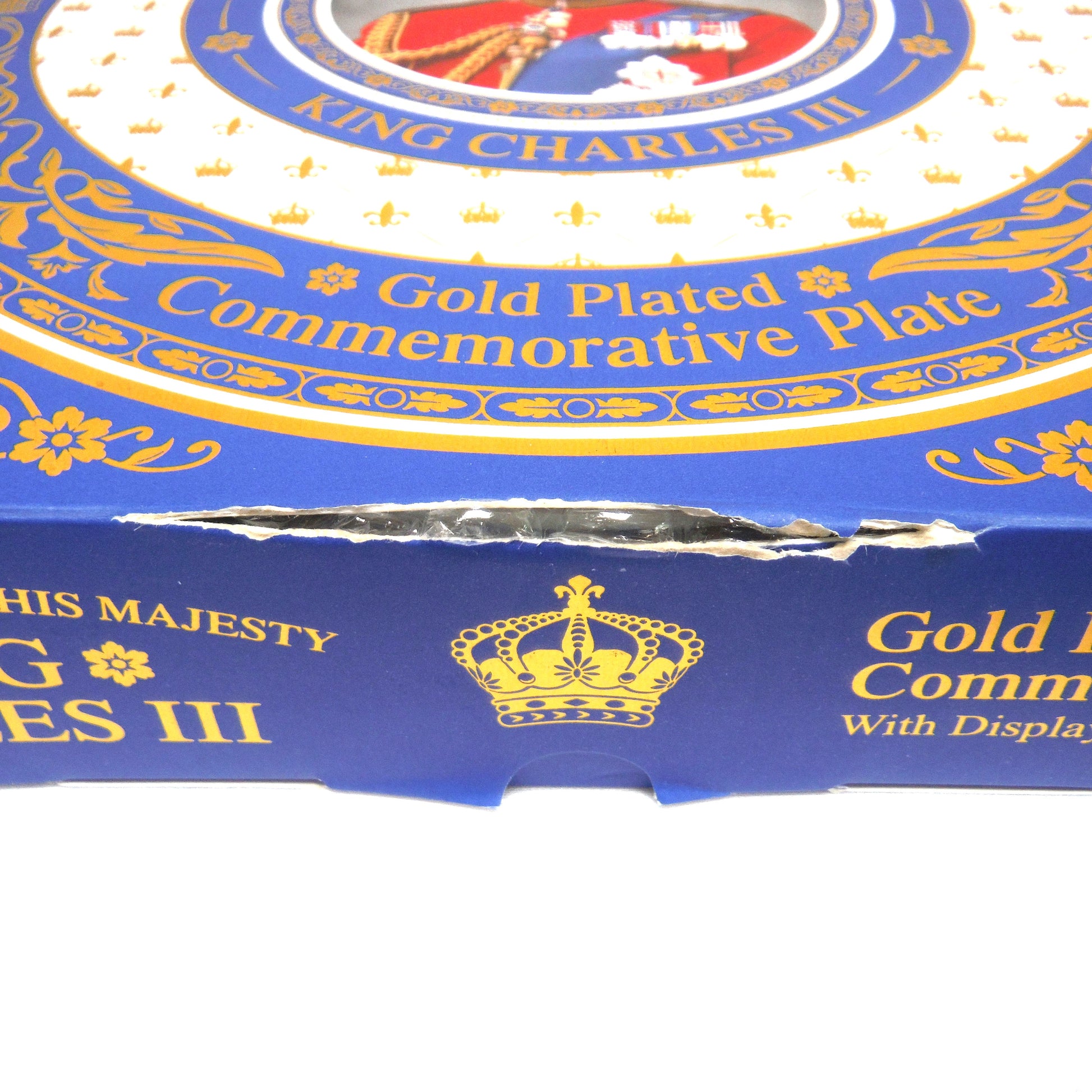 This is a beautiful contemporary Gold Plated Commemorative Plate honoring the Coronation of His Majesty King Charles III. The plate is in BRAND NEW, perfect condition. The box includes the unused cardboard stand (see main photo), but there is a tear above the opening on the box itself, likely from someone attempting to open it without noticing the flip-flap closure. (see last photo) Regardless, it's a stunning souvenir of our King's Coronation, crafted by Elgate Products Limited of Kent, United Kingdom, and it displays wonderfully.