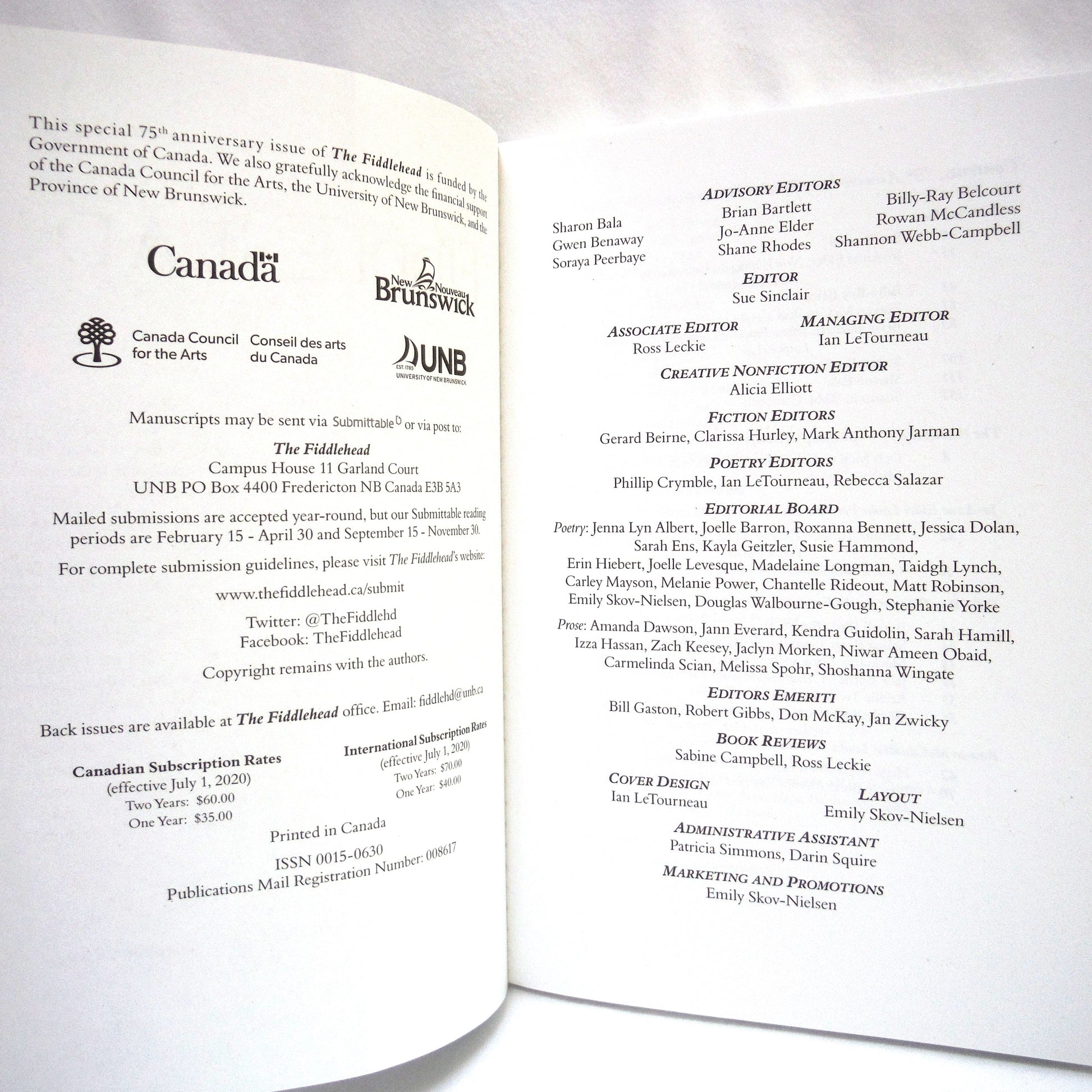 THE FIDDLEHEAD, Atlantic Canada's International Literary Journal, 75th Anniversary Issue 1945-2020, celebrates the fact that The Fiddlehead was first established in 1945.