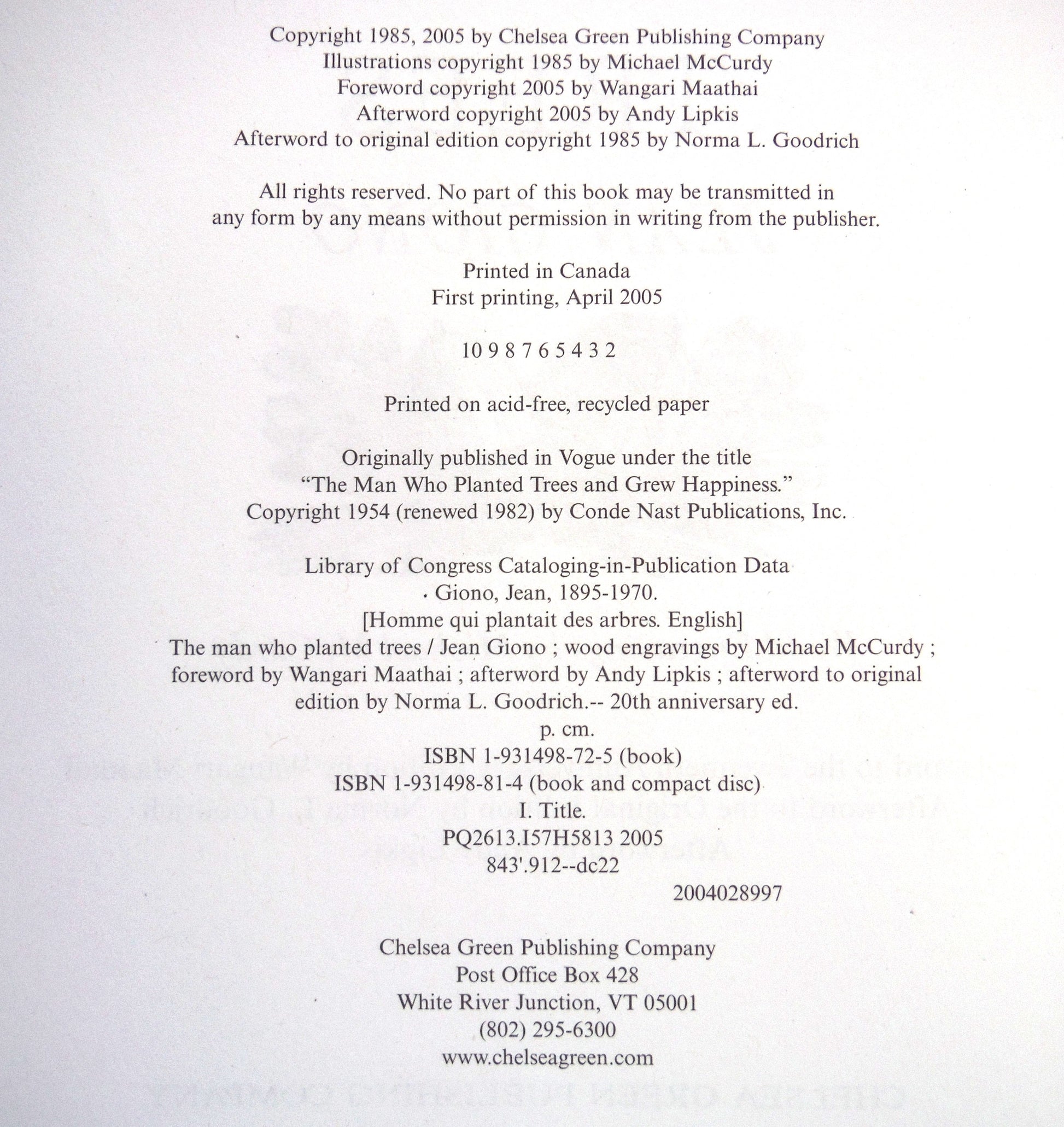 On National Arbor Day, April 29, 2005, Chelsea Green released this special twentieth anniversary edition with a new foreword by Wangari Maathai, winner of the 2004 Nobel Peace Prize and founder of the African Green Belt Movement.
