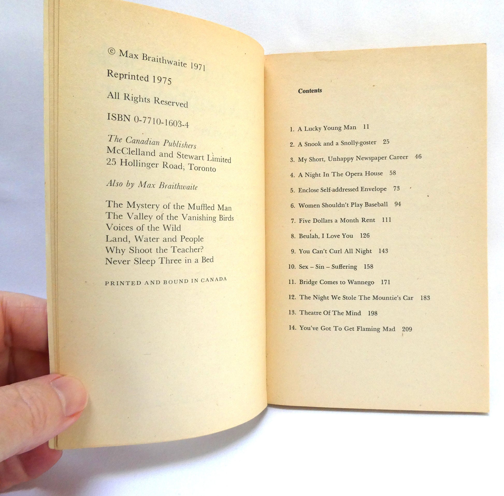 Author: Max Braithwaite. Published by McClelland and Stewart Ltd., 1971, 1st Edition. (Reprinted 1974) Printed in Canada. Almost New Condition SOFTCOVER Book, with light small tear at base of spine. Clean inside, tight spine. Size: 7 x 4.25 inch, 220 pages.