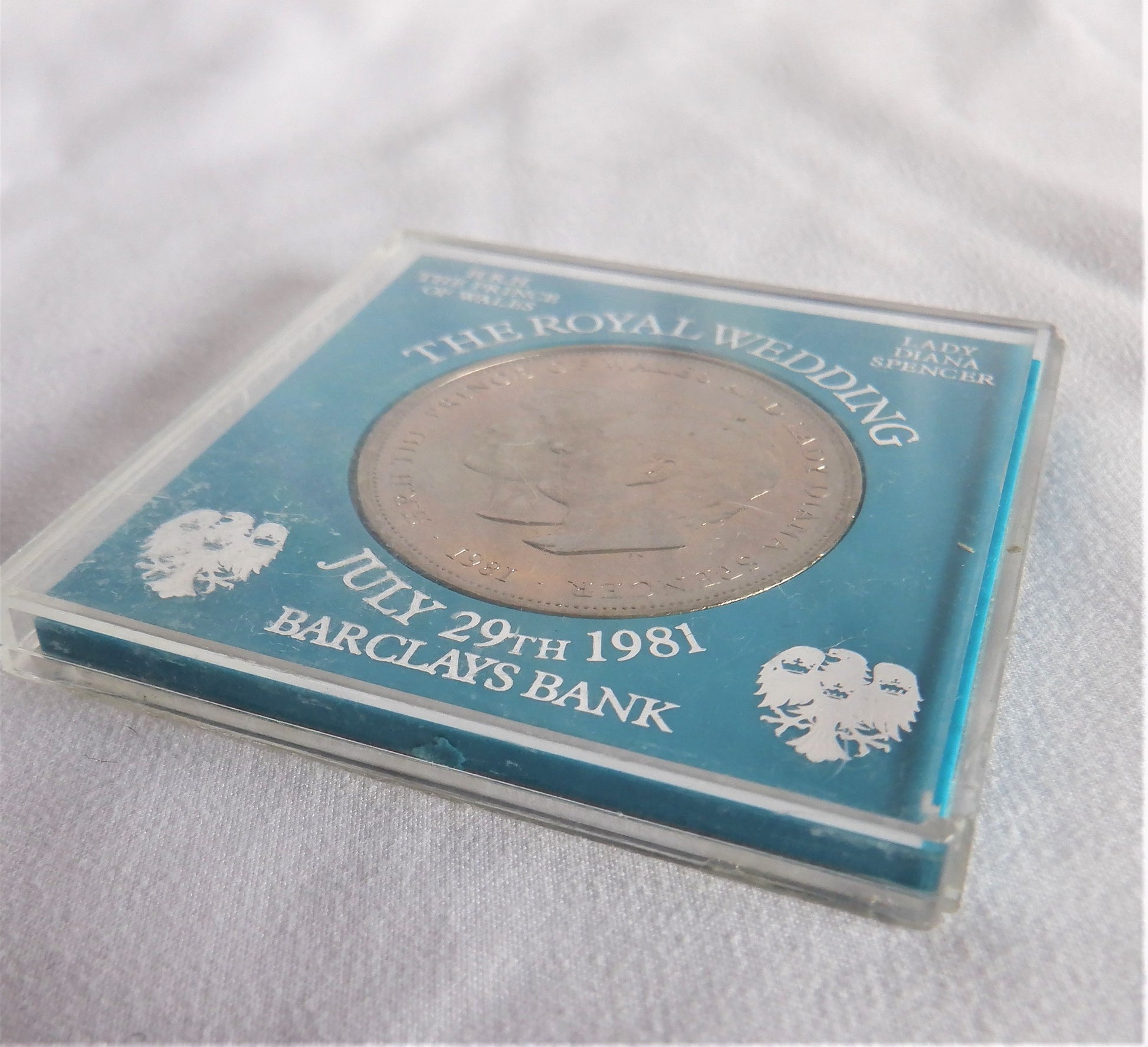 THE ROYAL WEDDING, Barklay's Bank Souvenir Crown Coin, 29th July 1981. Great Britain/UK 1981 – HRH The Prince of Wales and Lady Diana Spencer Wedding Commemorative Crown Coin in Uncirculated Condition (UNC) mounted in a presentation case with a double-sided view. Coin inside appears in MINT condition, but the outer case is scuffed. Photos are of actual coin for sale.