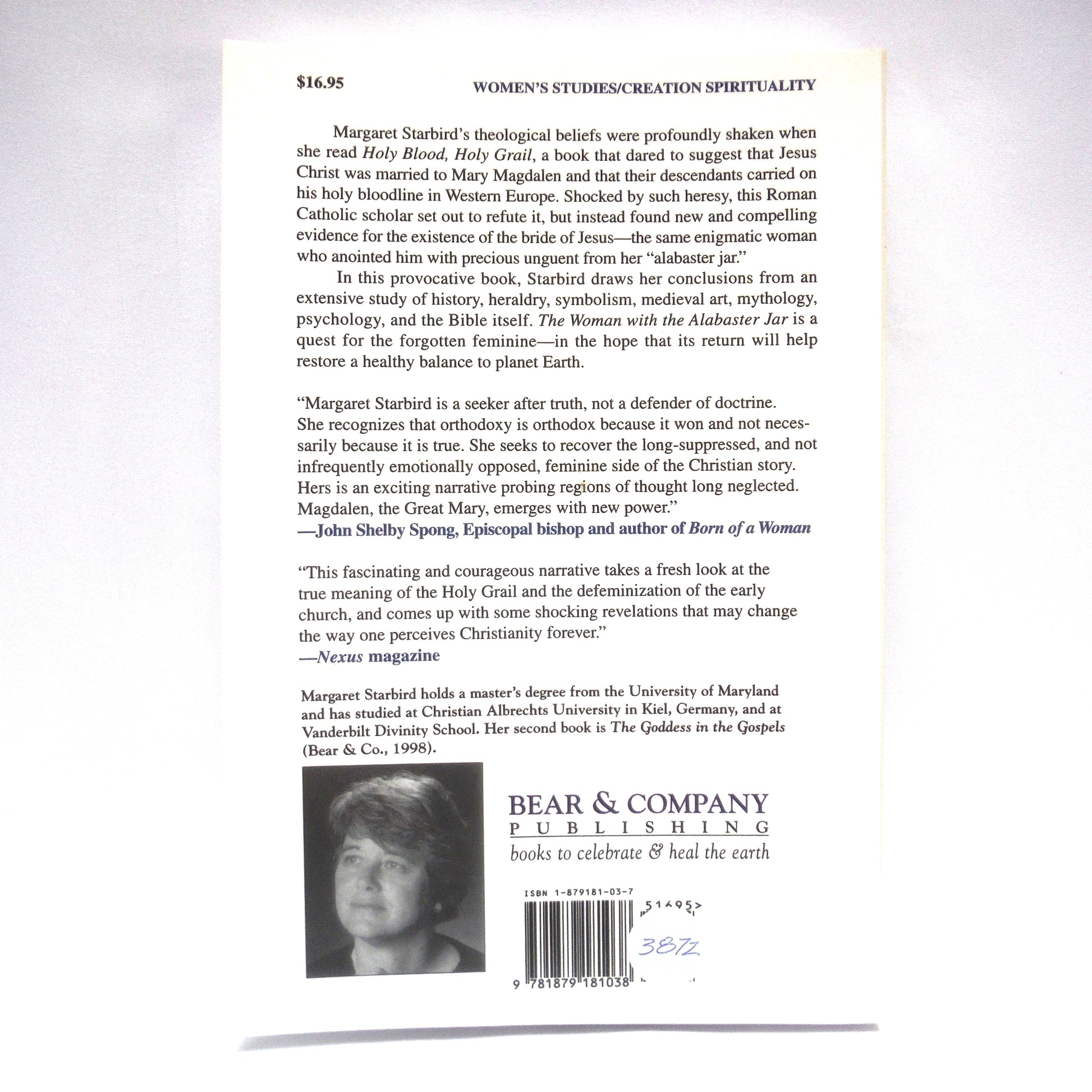 In this provocative book by Margaret Starbird, she draws her conclusions from an extensive study of history, heraldry, symbolism, medieval art, mythology, psychology, and the Bible itself. The Woman with the Alabaster Jar is a quest for the forgotten feminine--in the hope that its return will help restore a healthy balance to planet Earth.
