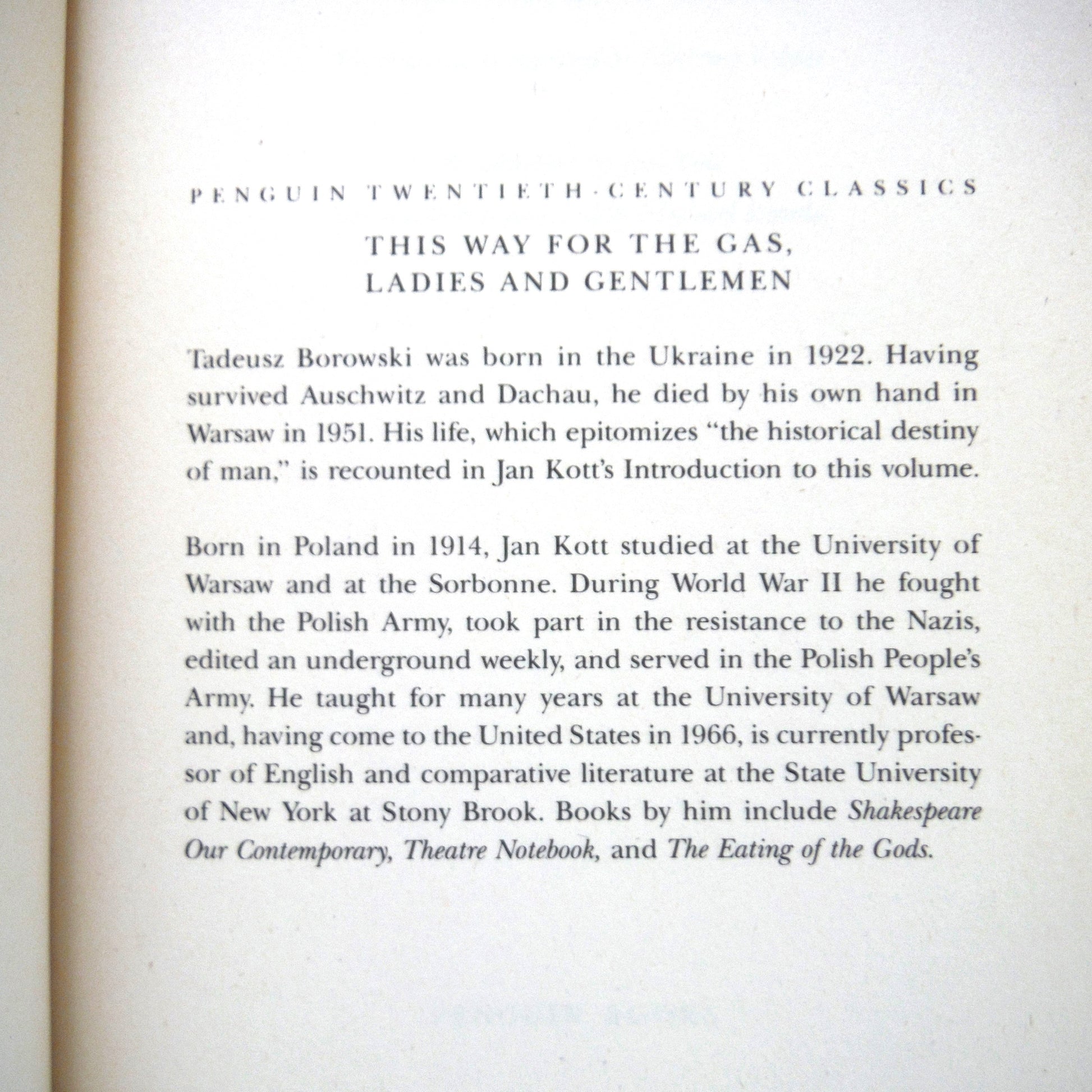 THIS WAY FOR THE GAS, LADIES AND GENTLEMEN, are Tadeusz Borowskiโs concentration camp stories, and were based on his own experiences surviving Auschwitz and Dachau.