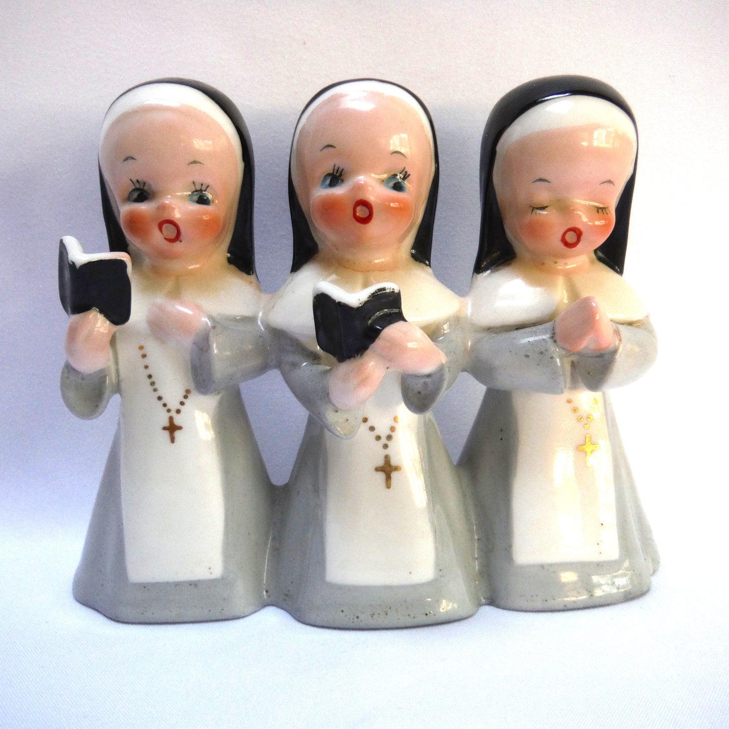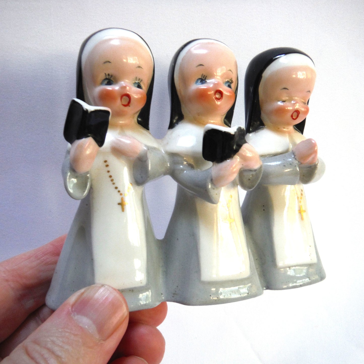 An Antique Ceramic Triple-Figurine that features THREE NUNS SINGING, PRAYING, and reading their HYMNAL BOOKS, well, two anyways. The third Nun is deep in prayer. The finish and glazing is well-done. The condition is like perfect, with no chips or cracks. The colour is still deep, and the hand-painted faces still shine bright with The Light!ย On the bottom are a few numbers, maybe stock numbers? Probably made in Japan in the 60's.