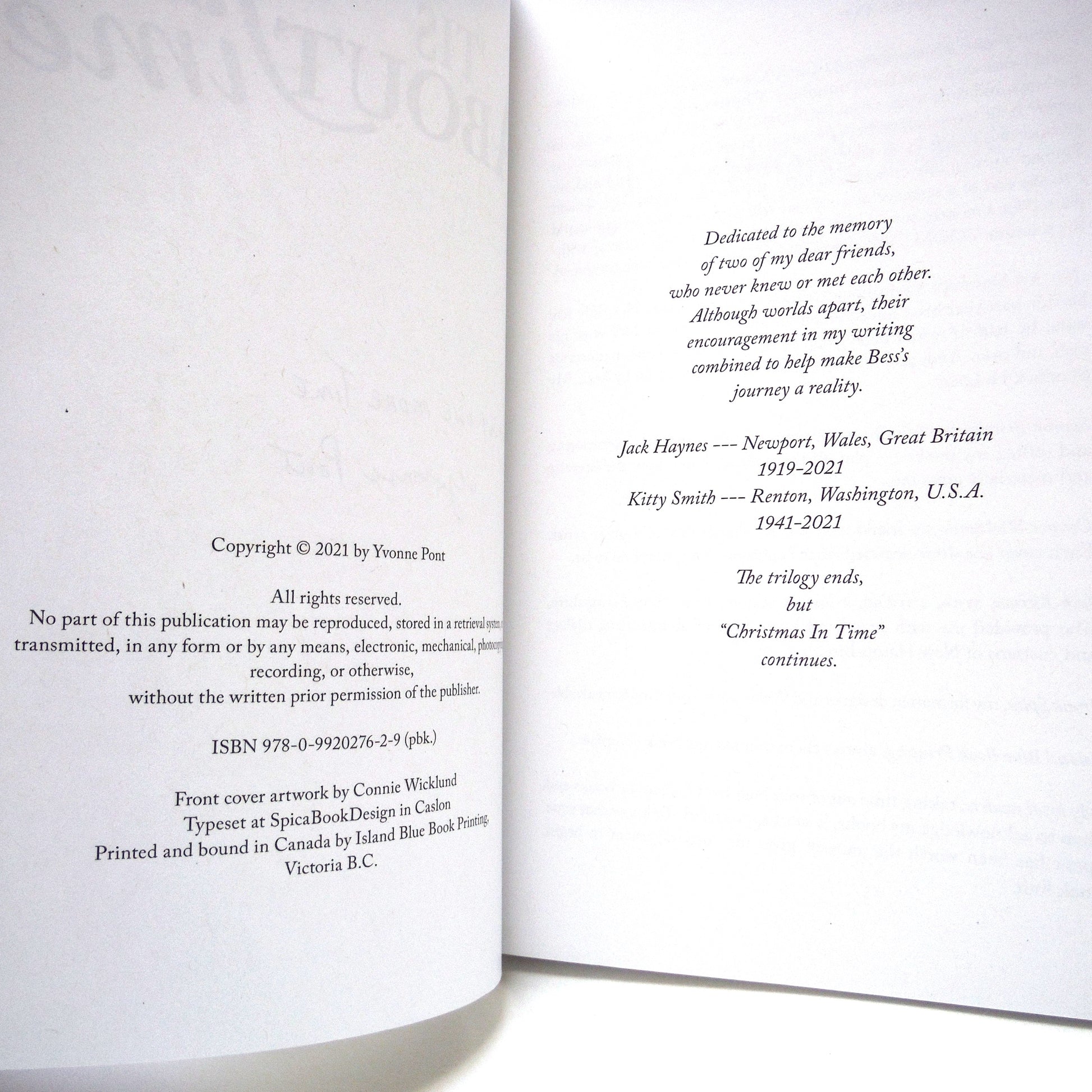 ABOUT THE AUTHOR, AND THE SERIES: Yvonne Pont, a native British Columbian, enjoyed a long career in the airline industry. Her love of travel and writing culminated in the creation of her debut novel, “The Bess Time,” her second novel, “Nick Of Time,” and now “’Tis About Time,” the third book of this trilogy. She is currently writing “Purrfect Time,” the fourth book in the “Christmas In Time” series. The series begins in the twenty-first century, travels back to the mid-nineteenth century and then journeys back and forth from one century to another century. Each novel in the series features its own particular Christmas In Time.