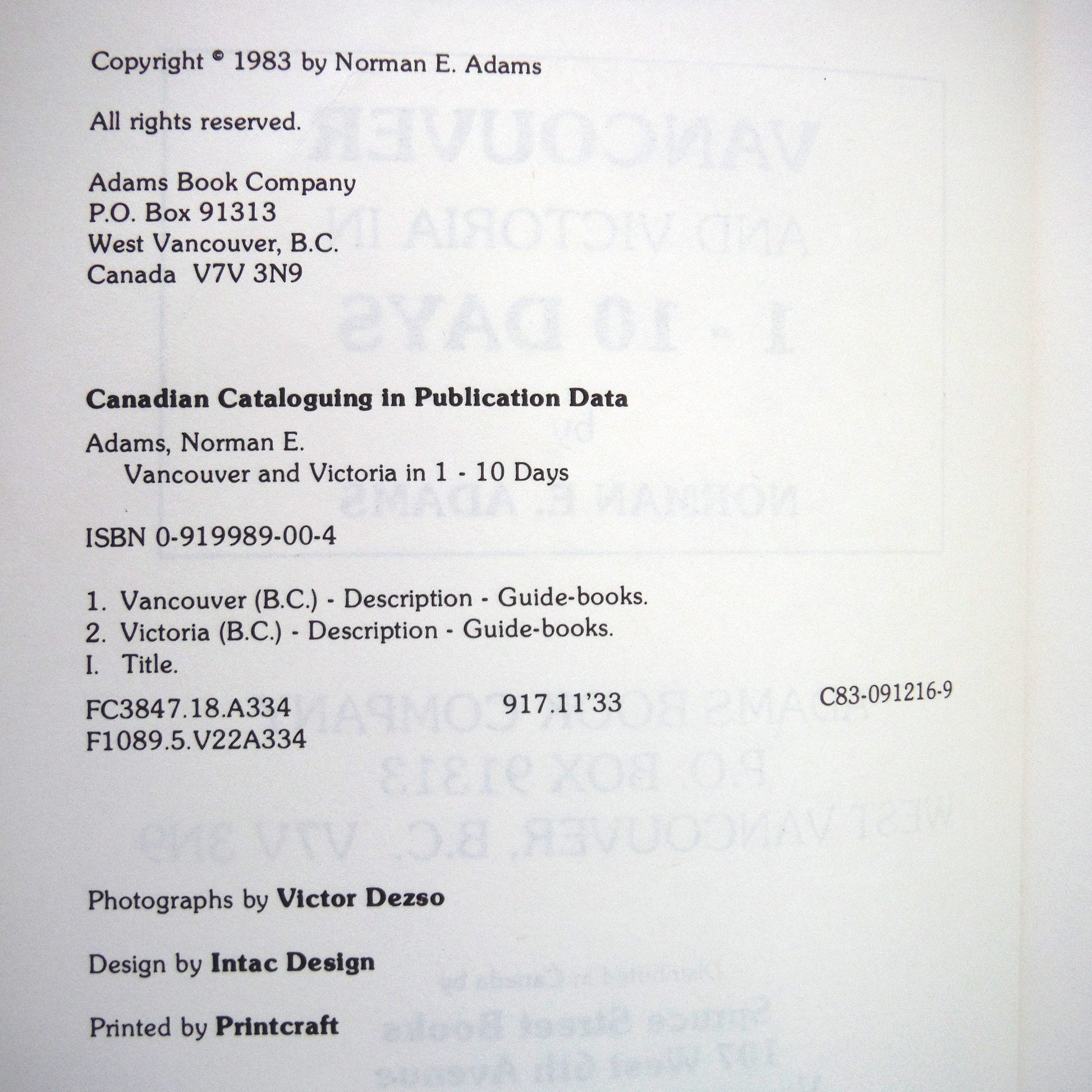 Author: Norman E. Adams. Photography by Victor Dezso. Published by Adams Book Company, North Vancouver, BC., 1983, 1st Edition. Printed in Canada by Printcraft. Very Good Condition SOFTCOVER Book, with minor handling. Clean inside, tight spine. Size: 8.5 x 5.5 inch, 148 pages.ย
