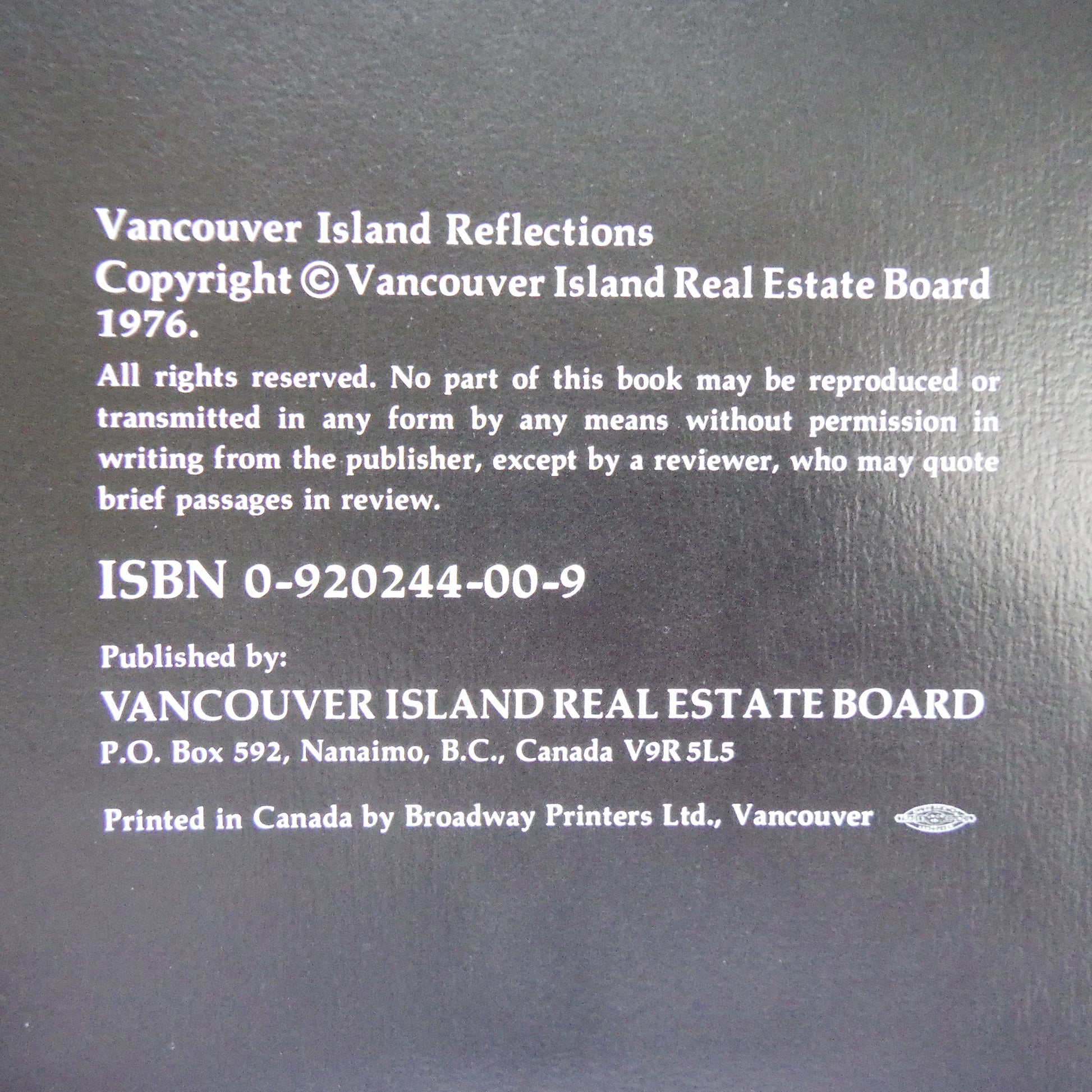 VANCOUVER ISLAND REFLECTIONS is a beautifully written, illustrated and bound book, and the photographs are now rather historical and nostalgic, and the full-colour full-page photographs are reminiscent of a quieter slower time on Vancouver Island.
