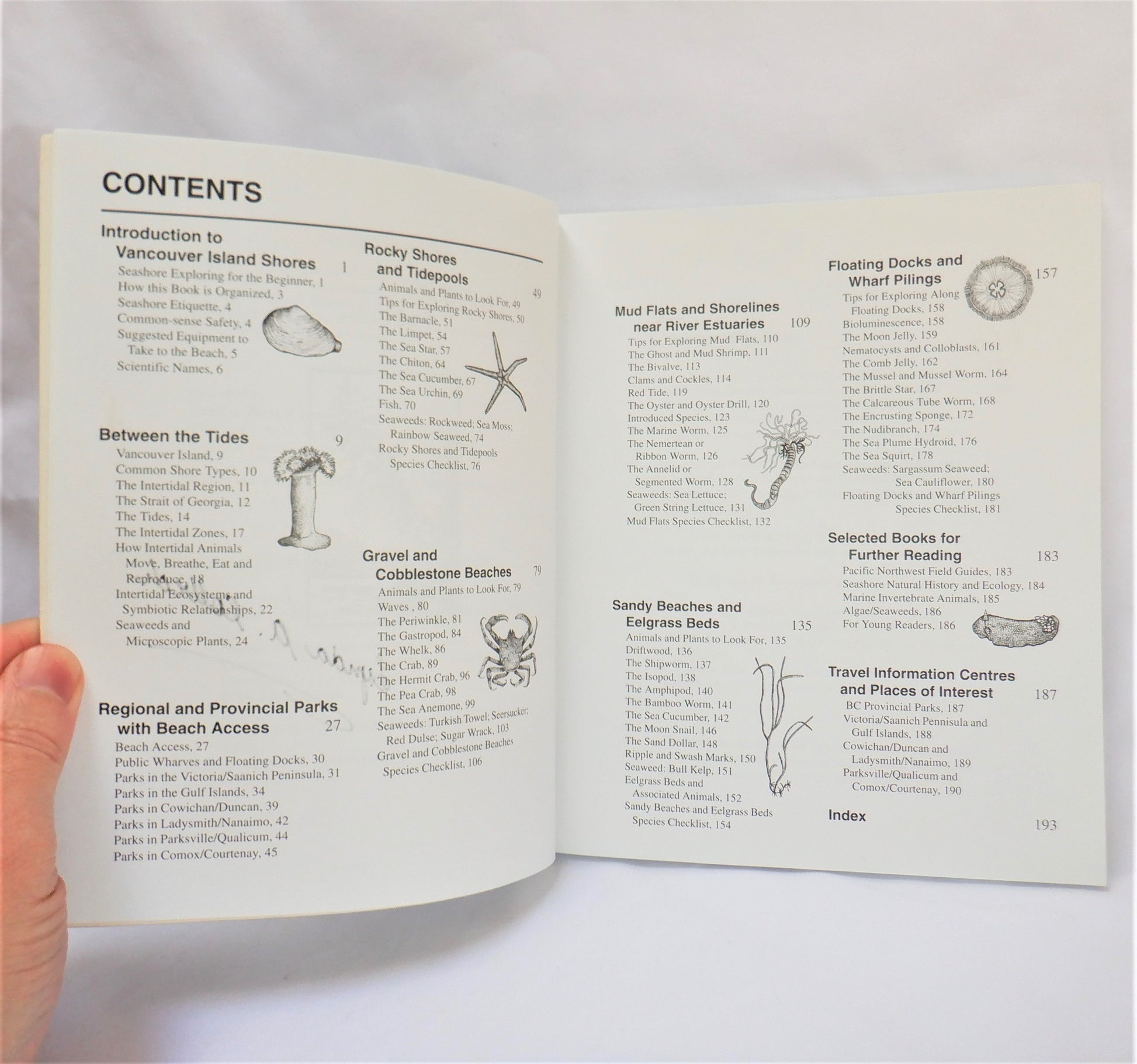 Many black and white illustrations by the author. Includes: plants and animals to look for; the natural history of seashore creatures; introduction to local seaweeds; detailed drawings and maps to provincial and regional parks.