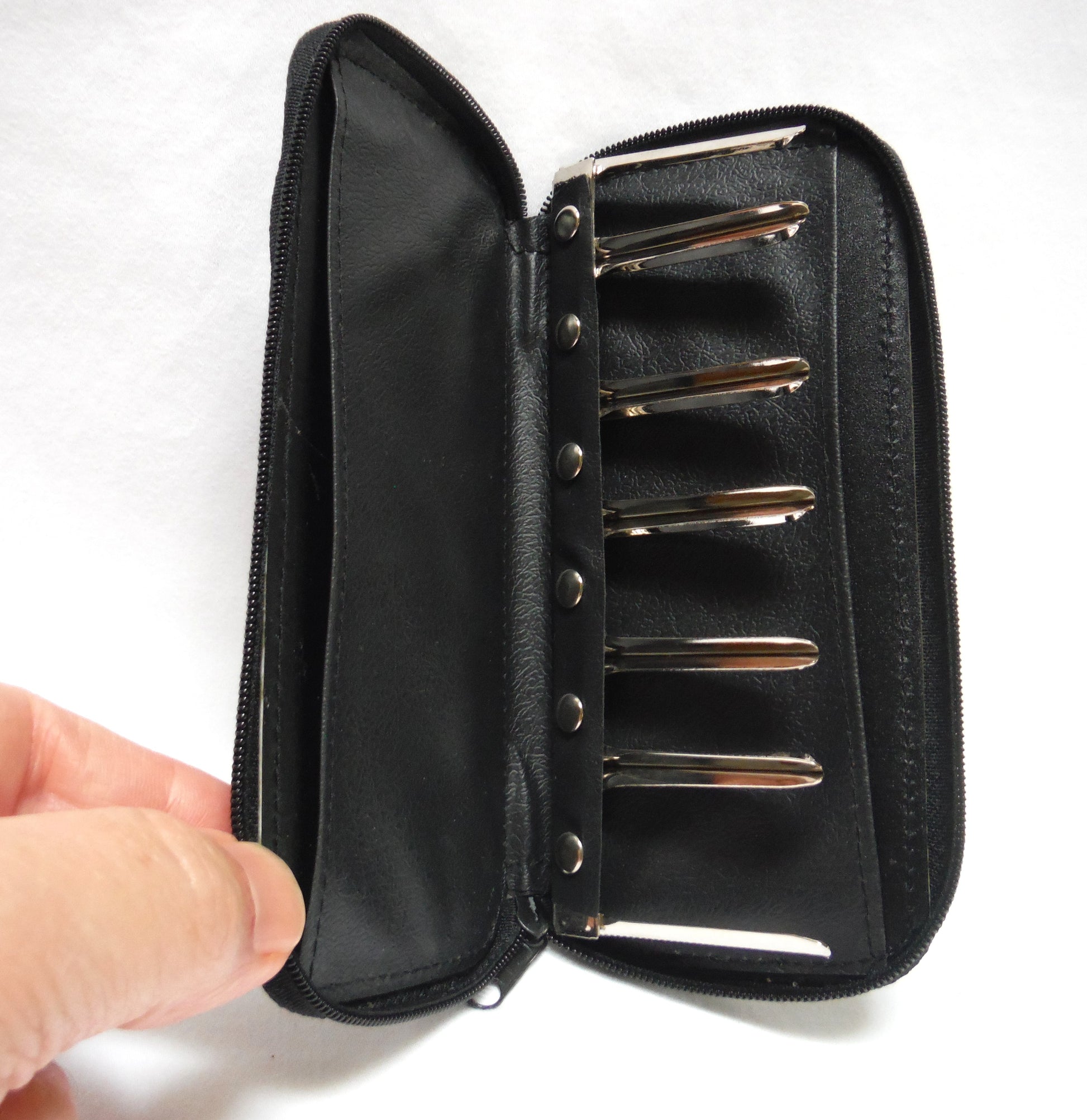 VINTAGE BRITISH POCKET COIN HOLDER, is made in a Black Leather, with a zippered on 3-sides closure. There are steel holders for the coins, rivetted onto the case. Condition is Mint, and appears never used. I say it's a British coin holder only because the Canadian coins do not fit in. There is no identifying mark or label to confirm manufacturer or location.