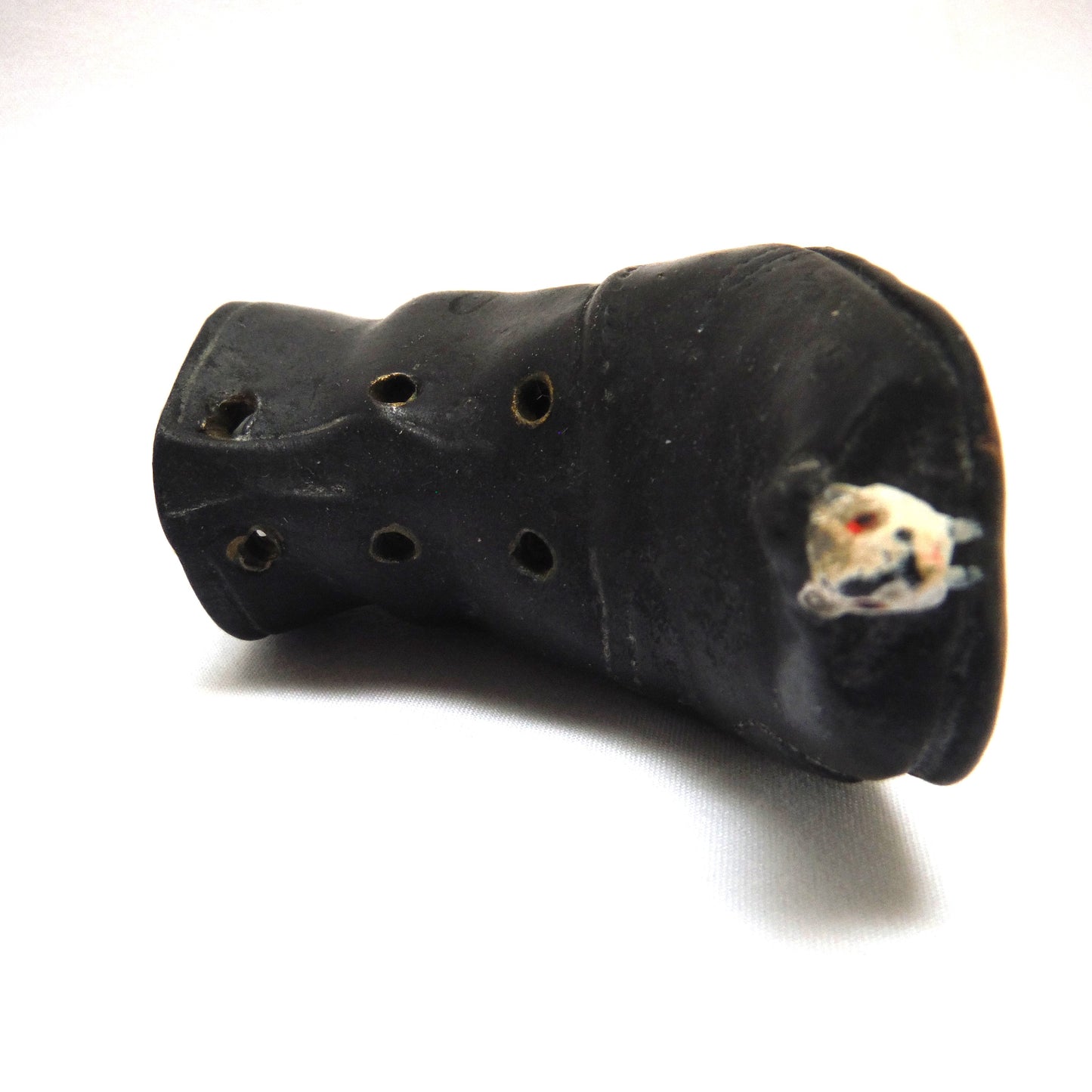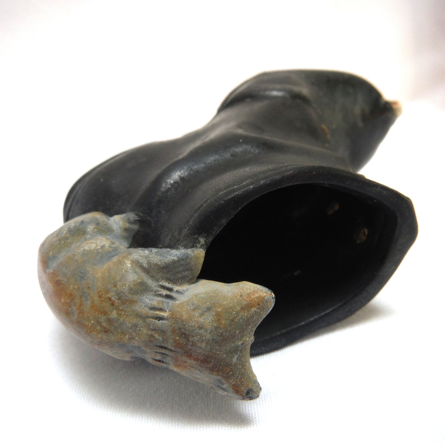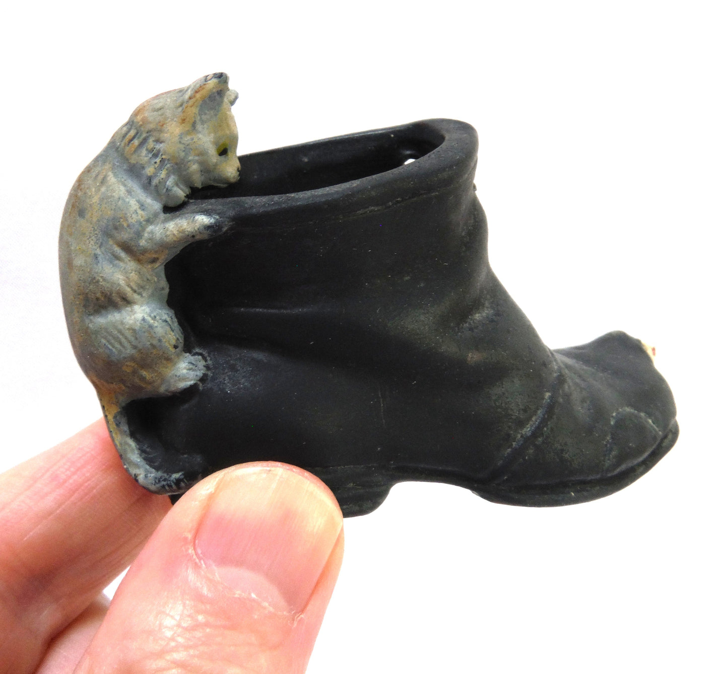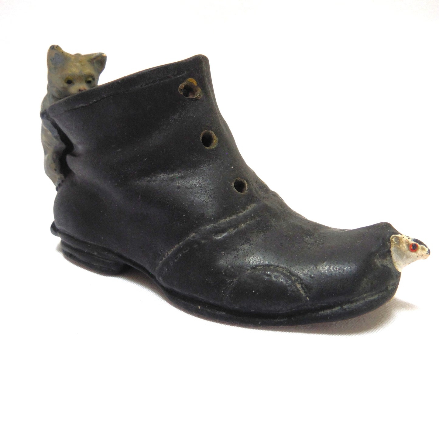 How could you not love this old Ceramic BLACK BOOT Statue, with a little PUSSY CAT that's trying to crawl in backway over the heel of the boot, while at the same time, The ESCAPING MOUSE is poking his head out the hole in the toe of the boot, haha. Statue is named something along the line of the original 'PUSS n'BOOTS, and while there's plenty of variants of this statue itself, I think this particular little pussy cat just talks to you, don't you?