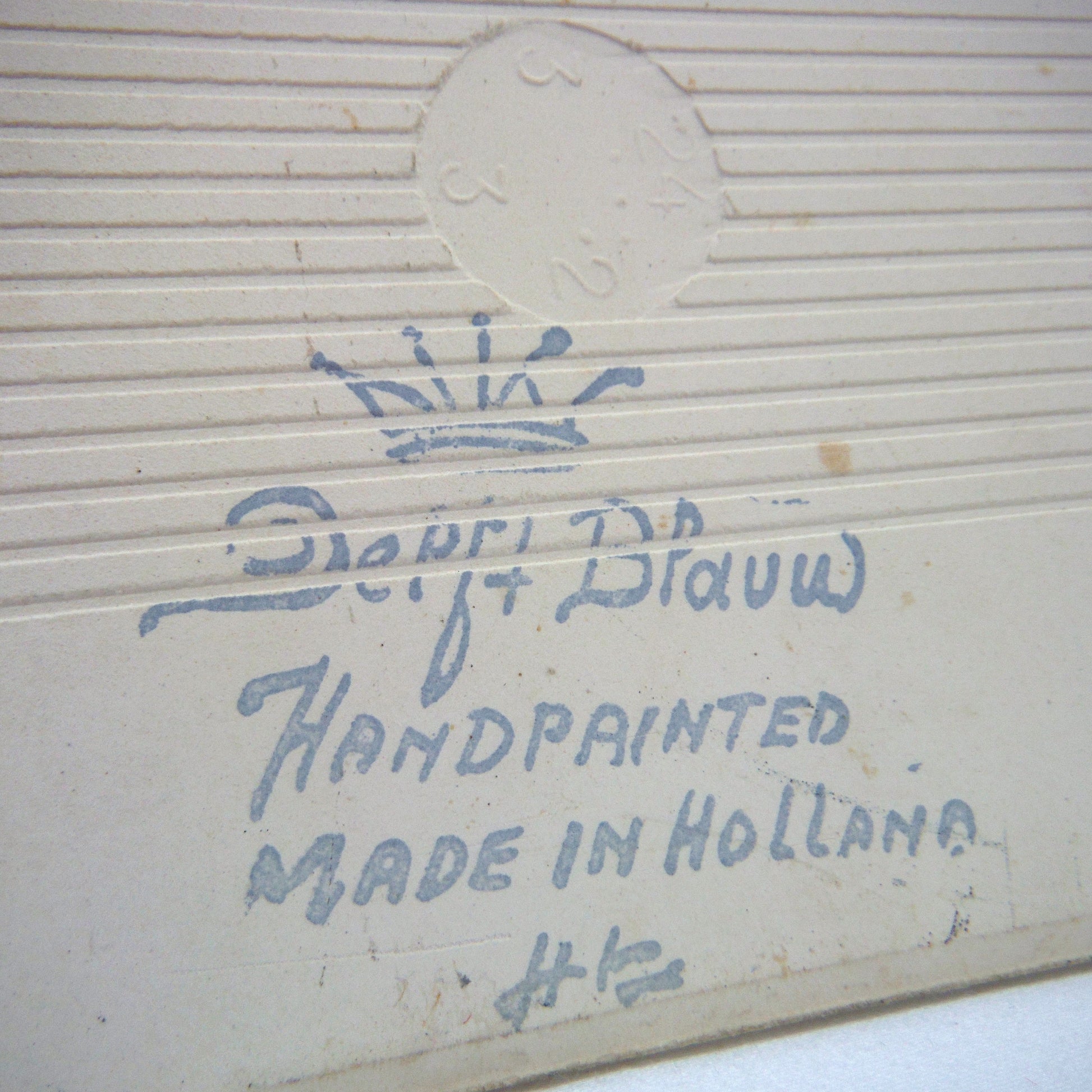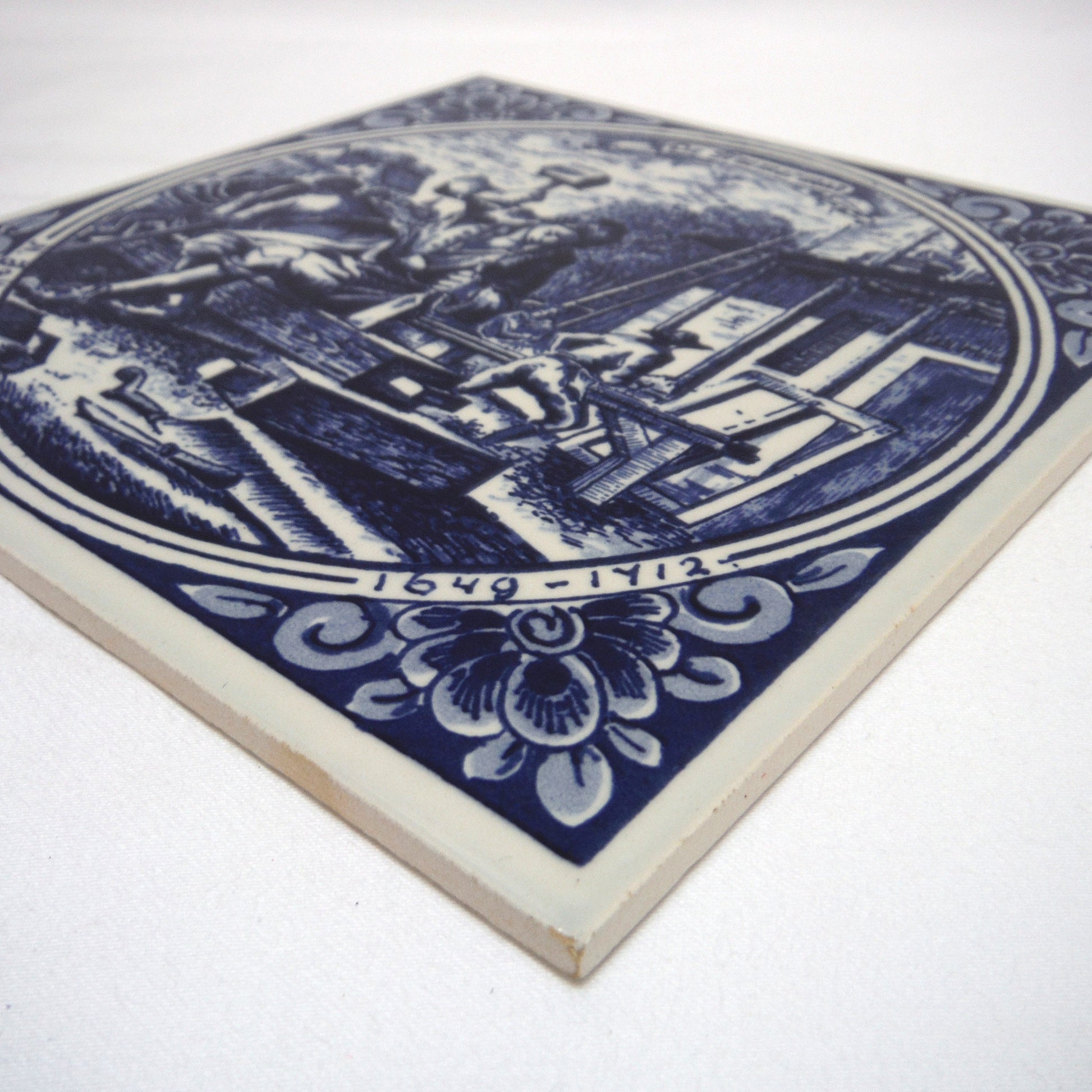 Another stunning vintage Hand Painted Delft Blue 6 x 6 inch CERAMIC TILE, featuring an image of: 'De Timmerman.' Condition is Excellent, no chips, cracks or crazing. Image is vivid and clear, in brand new condition. The back has the original rope wall-hanger, along with several maker marks. Of note is the mark "G" which may mean that Goebel made the tile, and Delft decorated it. Made in Holland.