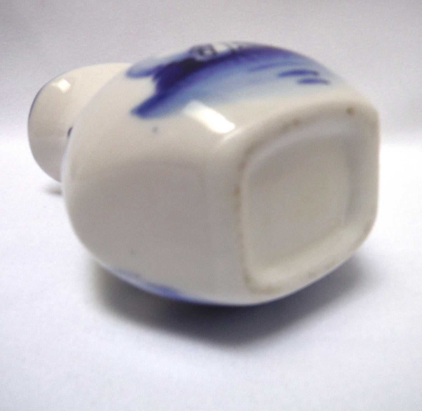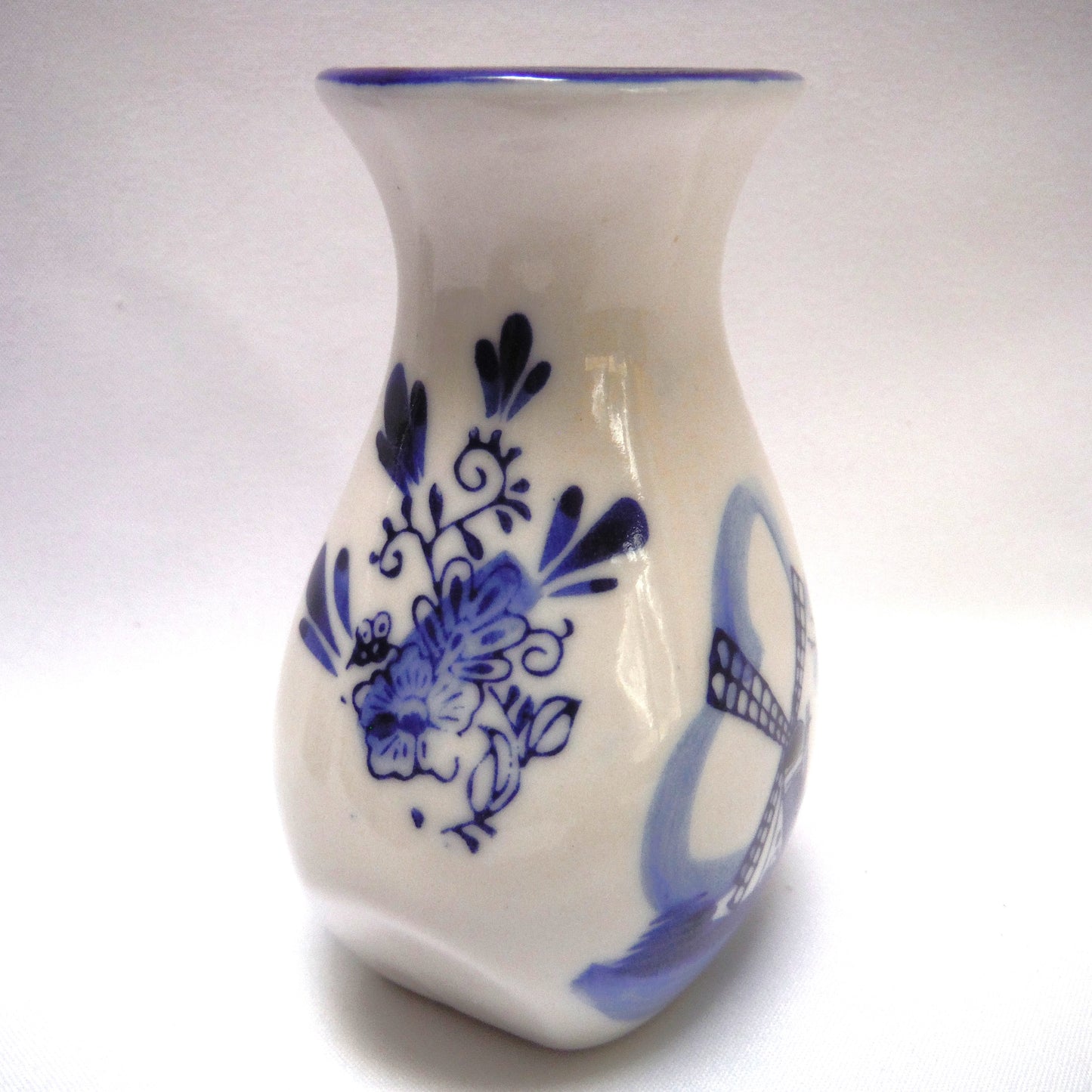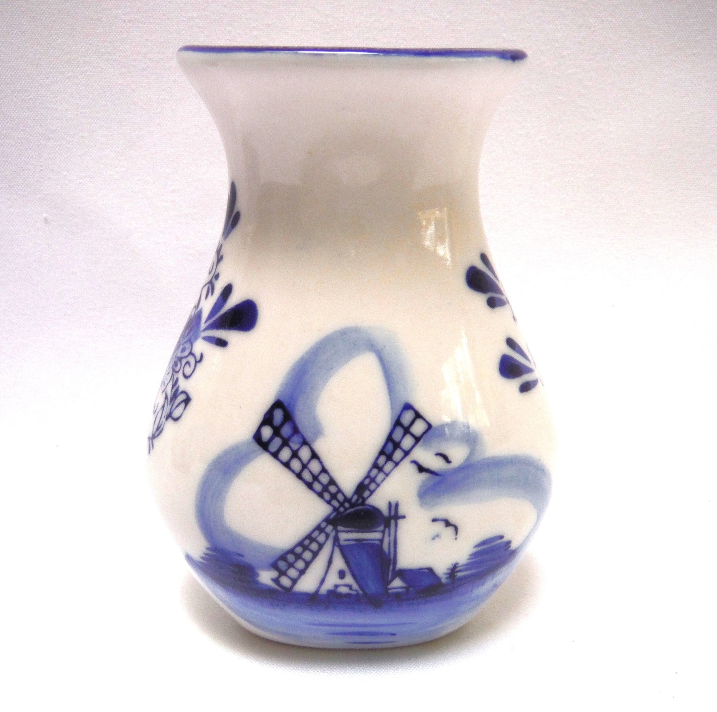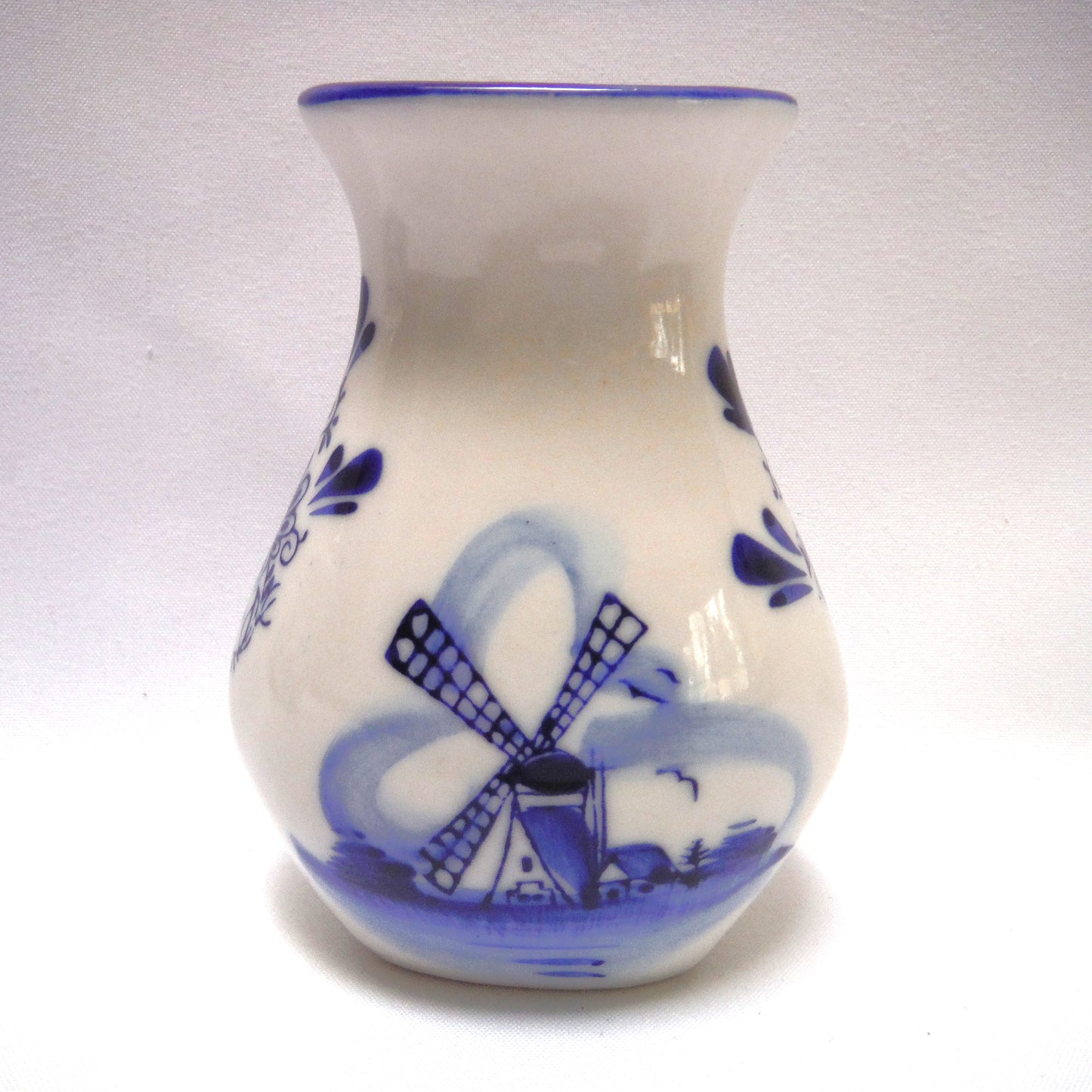 Vintage Hand Painted Delfts Blue Miniature VASE with Windmill Country Scene, is in fabulous condition, with no chips or cracks. Beautifully decorated all around in the deep blues that Delfts is famous for, with a deep blue trim around the eliptical mouth. Made in Holland.