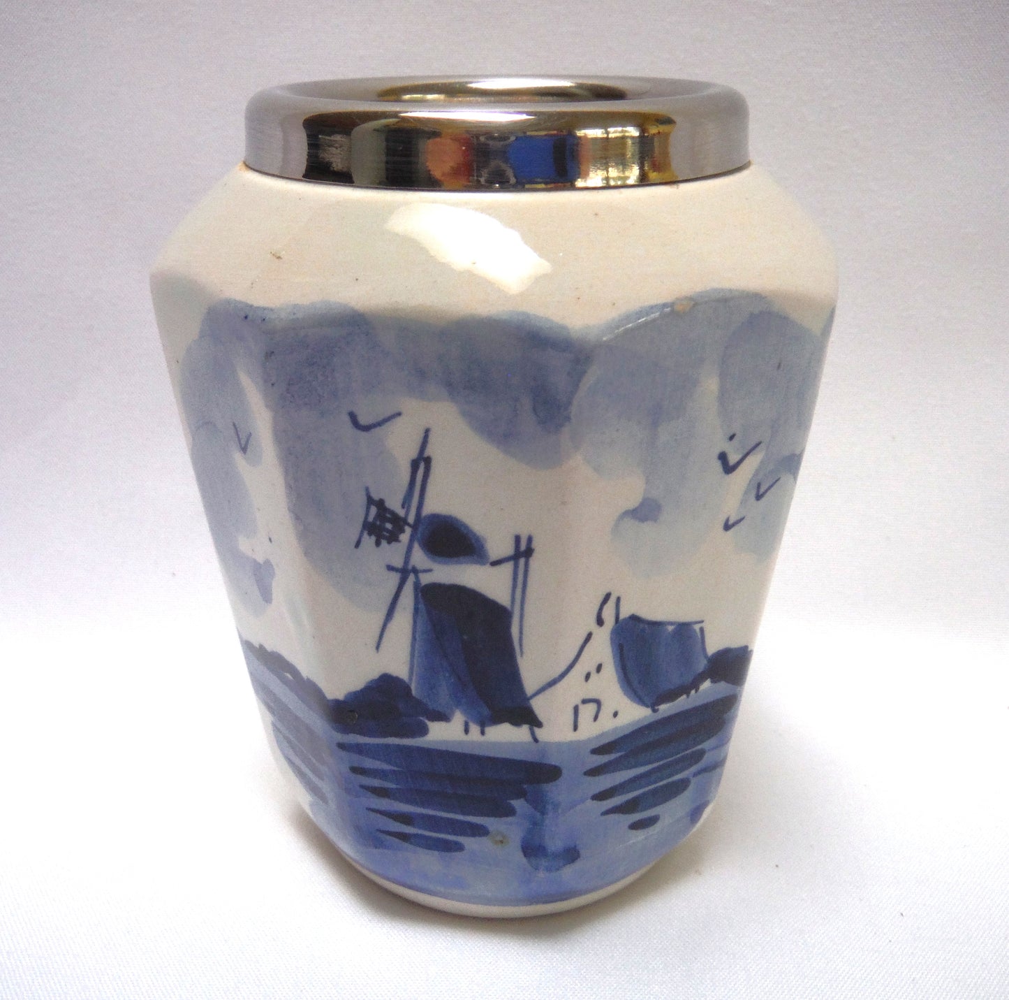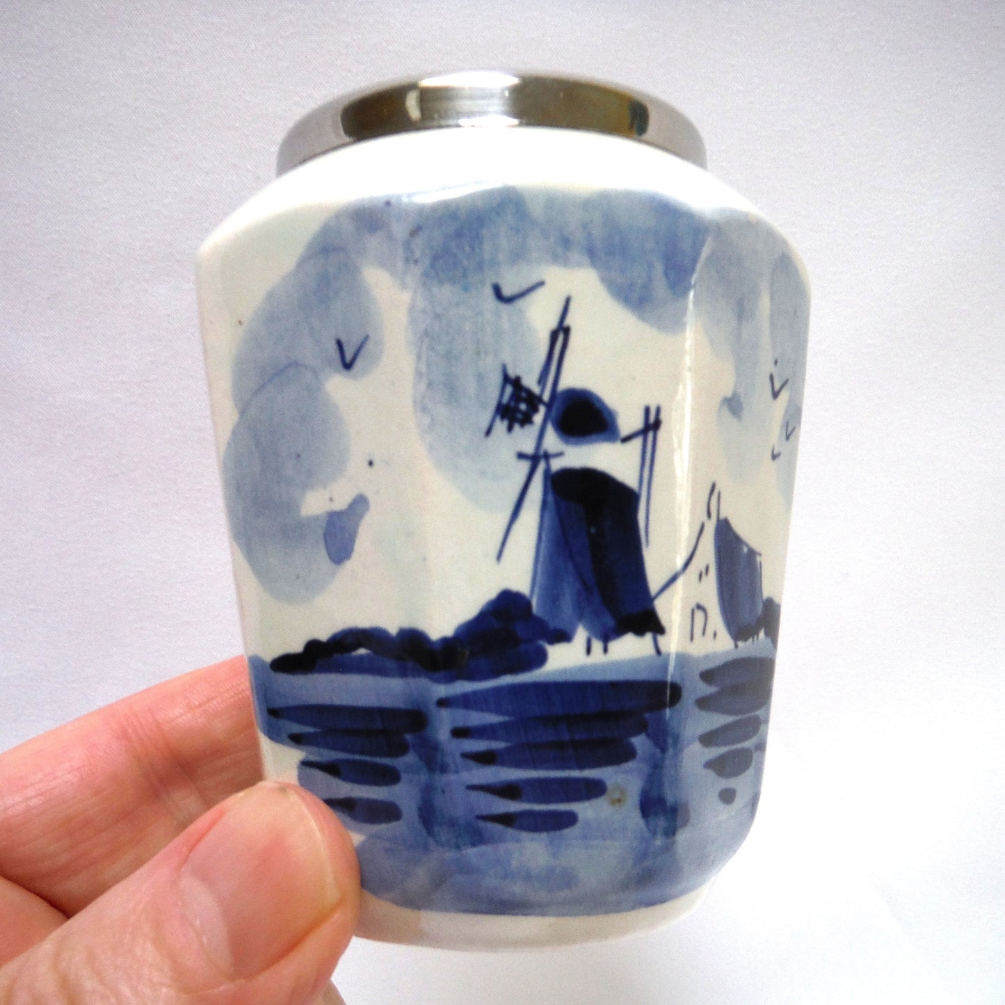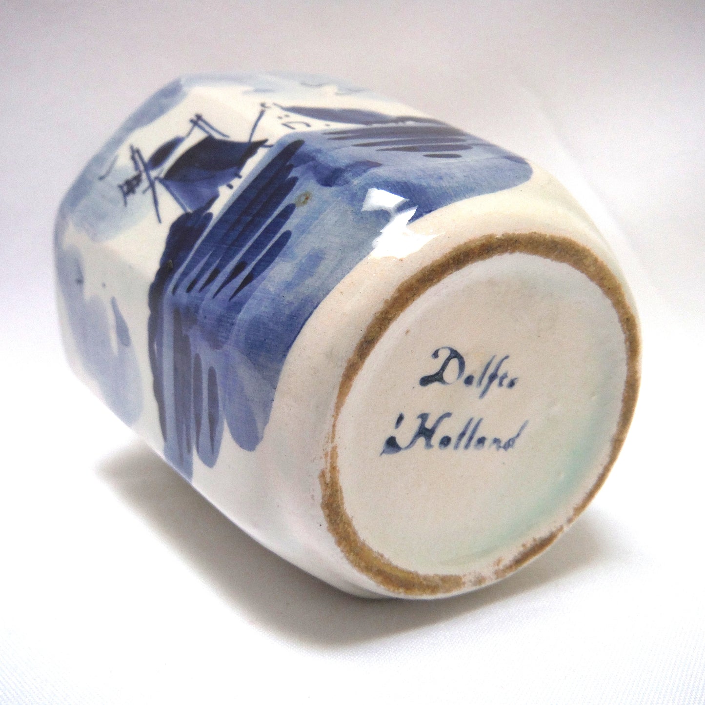 Vintage Hand Painted Delfts Blue Silver-Rimmed Eight-Sided Mini Vase: TRADITIONAL HOLLAND SCENE