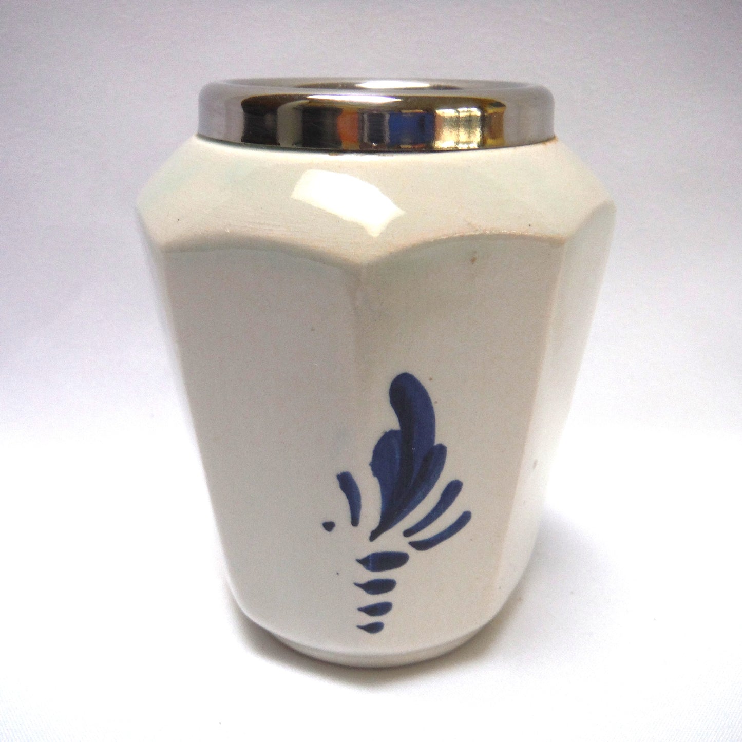 The striking silver-edged rim on this vintage Hand Painted Delfts Blue Vase, contrasts beautifully with the Traditional Holland Scene of windmill, water and out buildings. This image wraps around one half of this unique eight-sided vase. The other half features a simple design in deep blue, and the bottom is stamped. Condition seems perfect, but there is minor below-surface crazing, and it could use a gentle clean. Made in Holland.