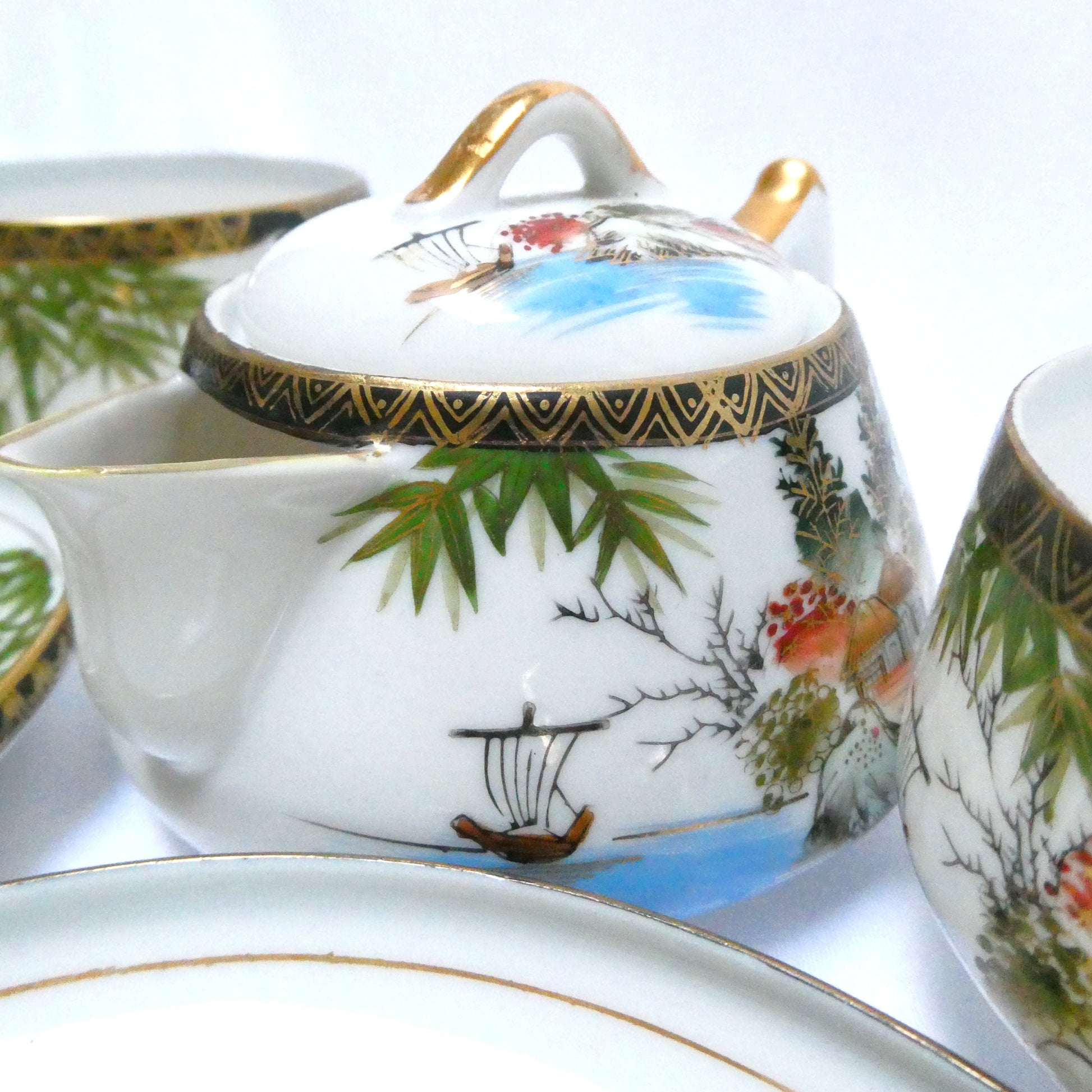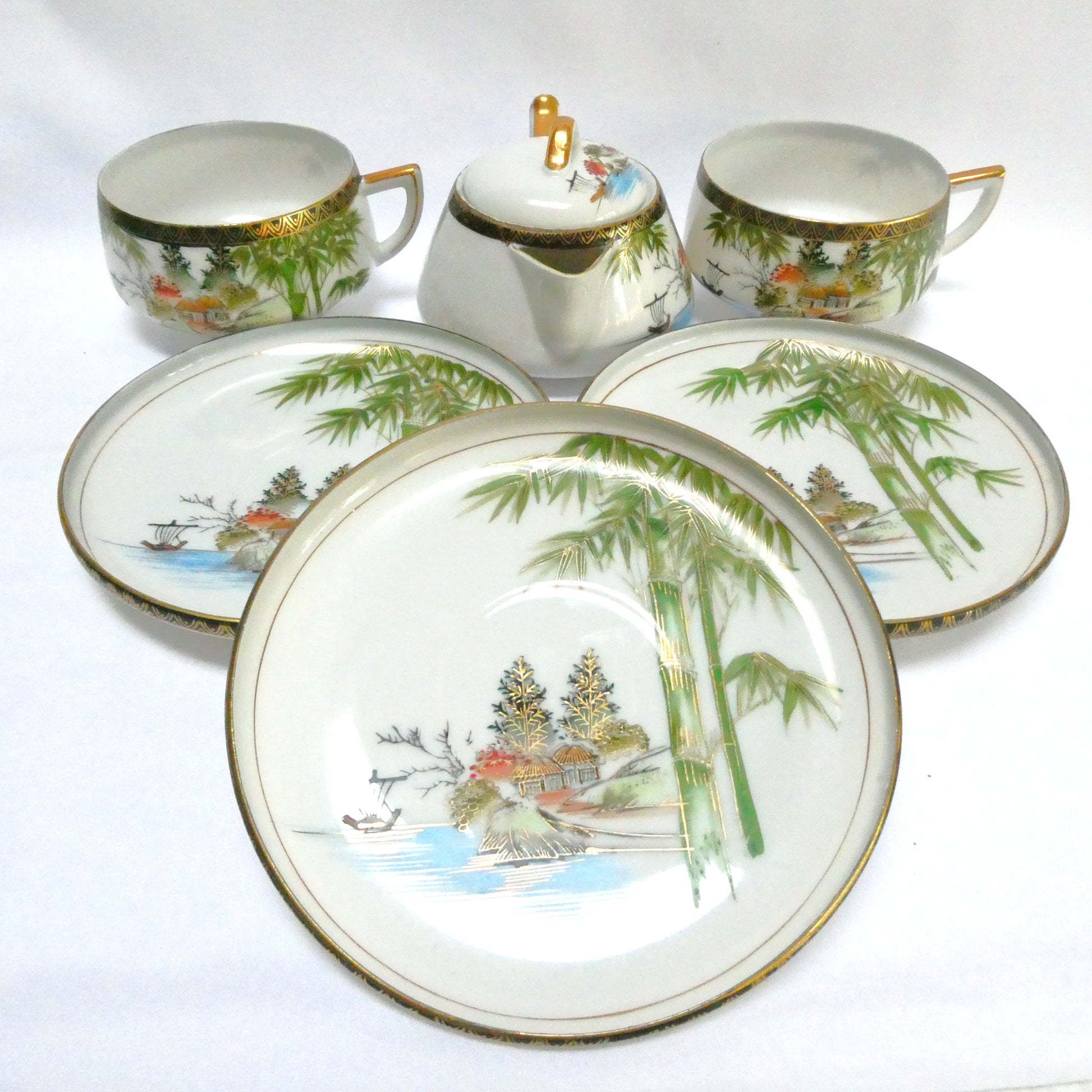 Vintage Hand-Painted Japanese Kutani ware 6-Piece Teapot, Teacups and Saucers in the Landscape and Bamboo Motif