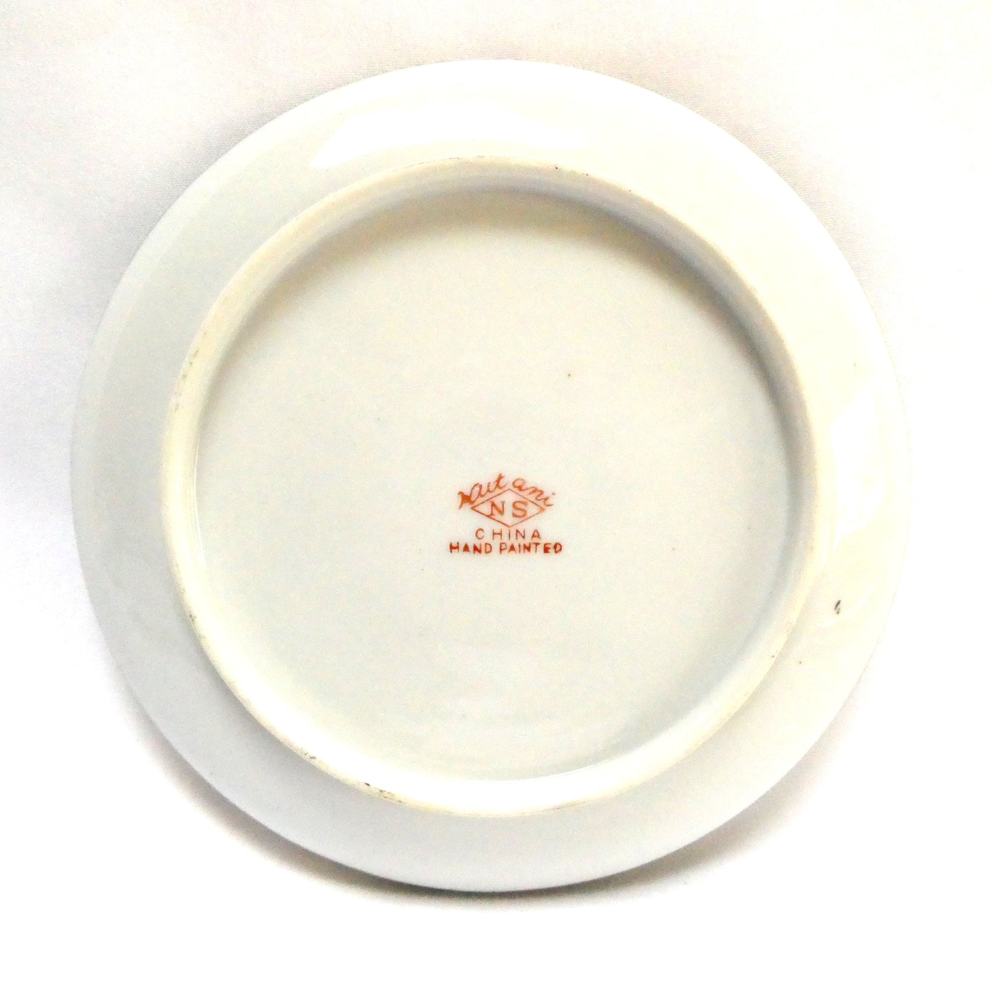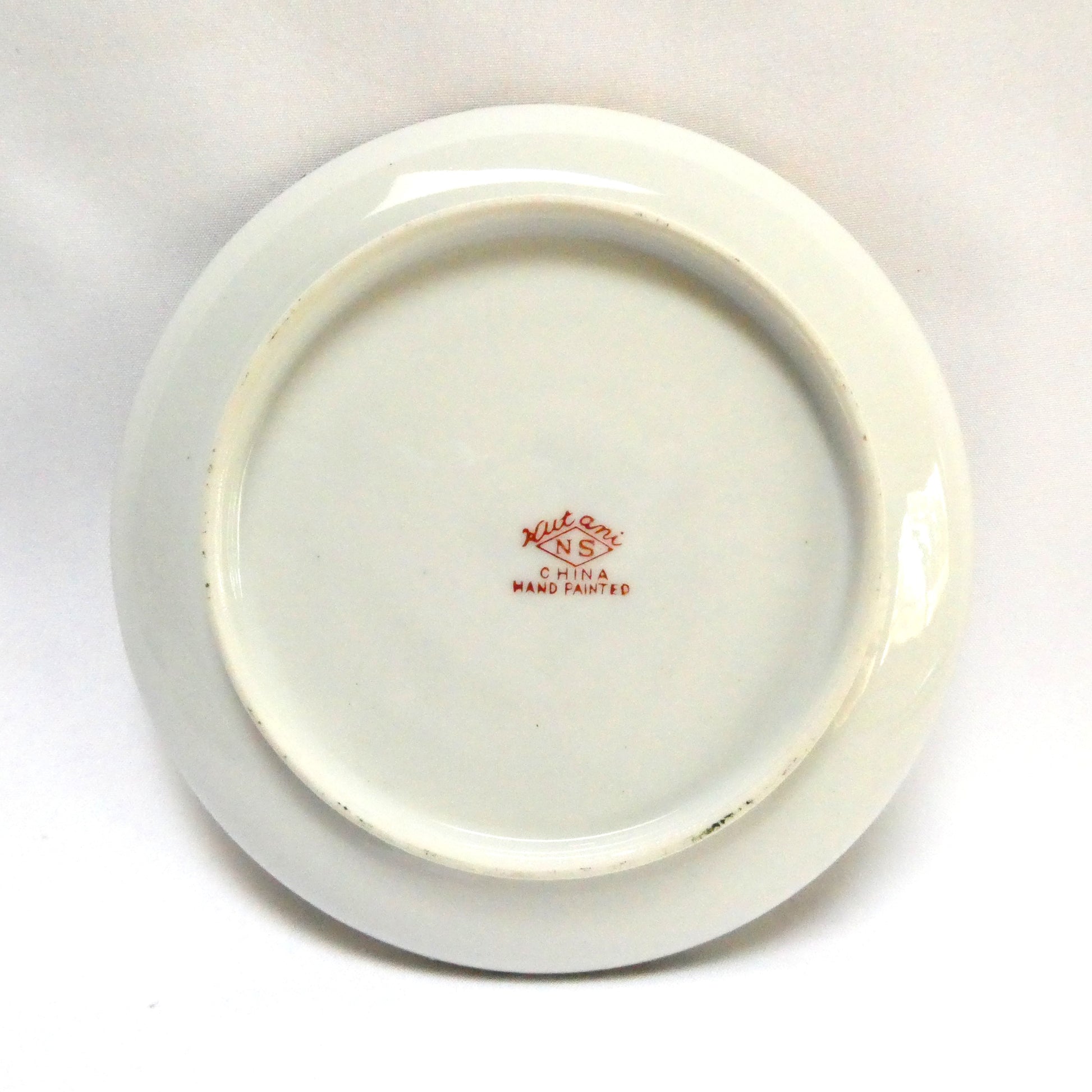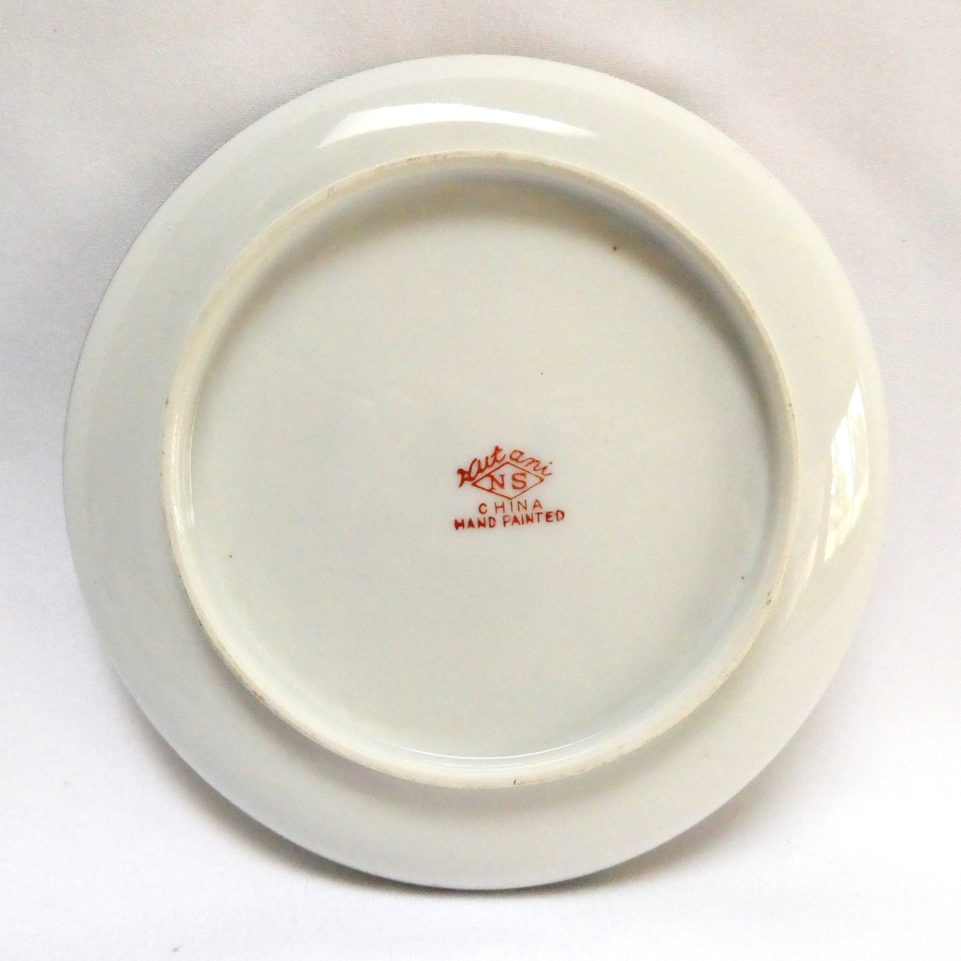Makers marks on the bottom of this vintage Kutani, made for export and during the era when wares were labeled "CHINA HAND PAINTED," often feature as this set does, a red diamond mark with "NS." This mark represents a distributor or importer rather than a specific manufacturer, and is commonly seen on mid-20th century Kutani-style porcelain.