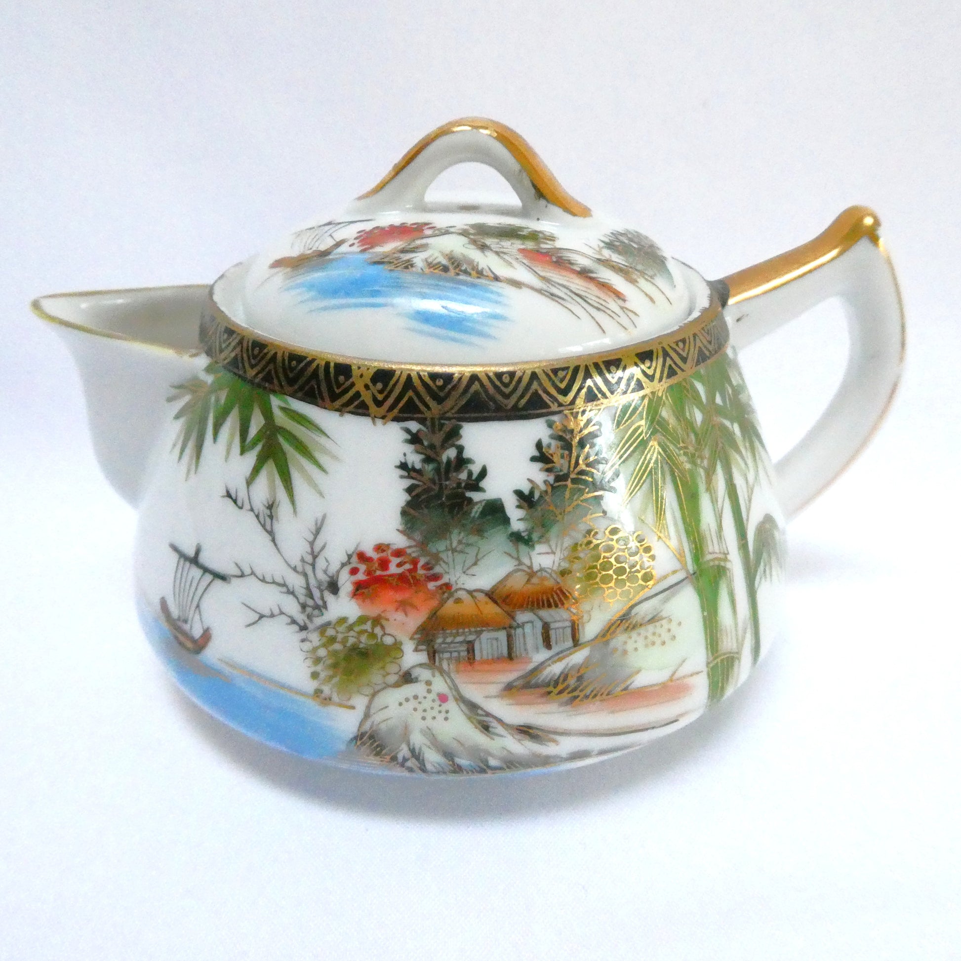 Vintage Hand-Painted Japanese Kutani ware 6-Piece Teapot, Teacups and Saucers in the famous Landscape and Bamboo Motif, with an exquisite eggshell finish. Condition appears to never have been used. Everything is EXCELLENT, no chips or cracks. No wear or scratches on the images, and the gold trim is deep and vibrant. Made in Japan.