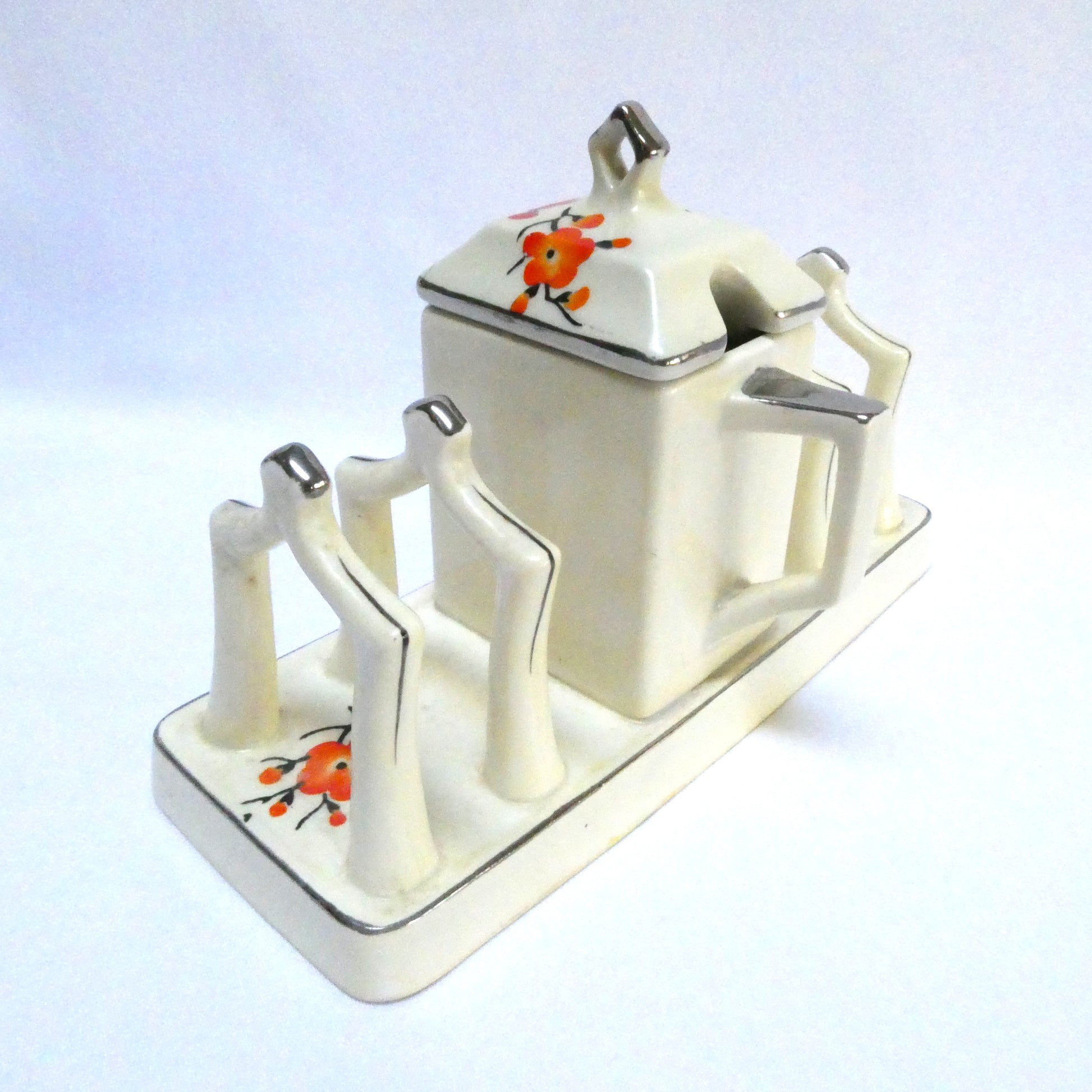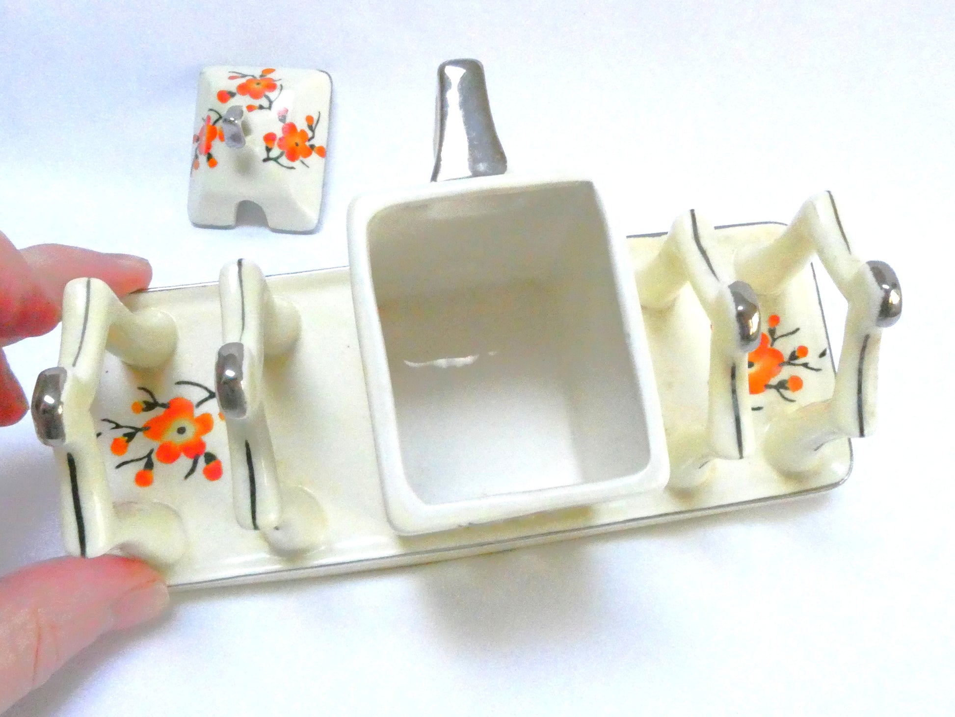 This vintage Japanese 4-slot toast rack and covered jam caddy features hand-painted orange cherry blossoms. It’s in excellent condition, with no visible cracks or chips, just some natural glazing beneath the brilliant glaze finish. The creamy white base is adorned with stunning flowers and accented with silver trim. The charming little jam jar has a cute handle (though it’s not removable) and a detachable lid. The base is stamped with the manufacturer’s logo and marked “Made in Japan.”