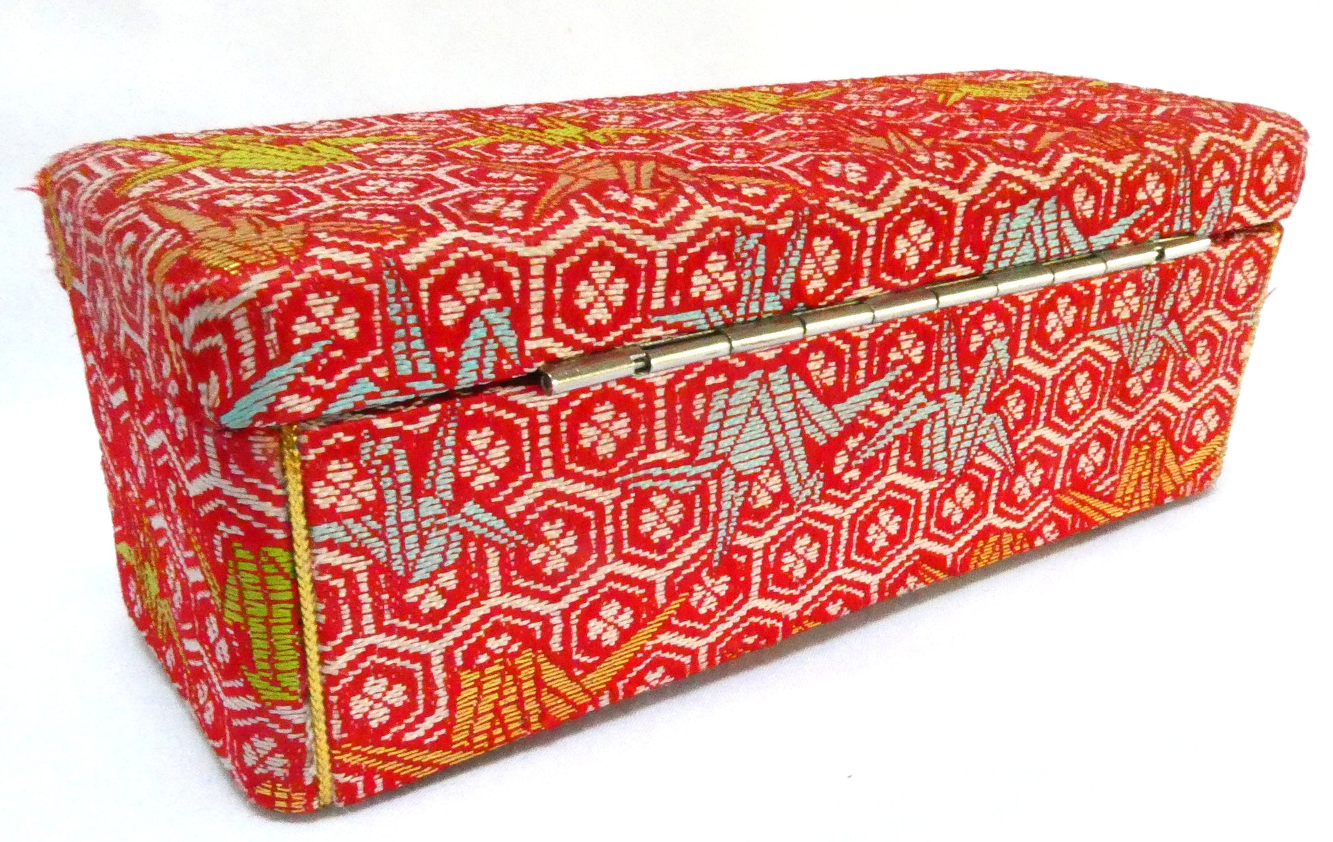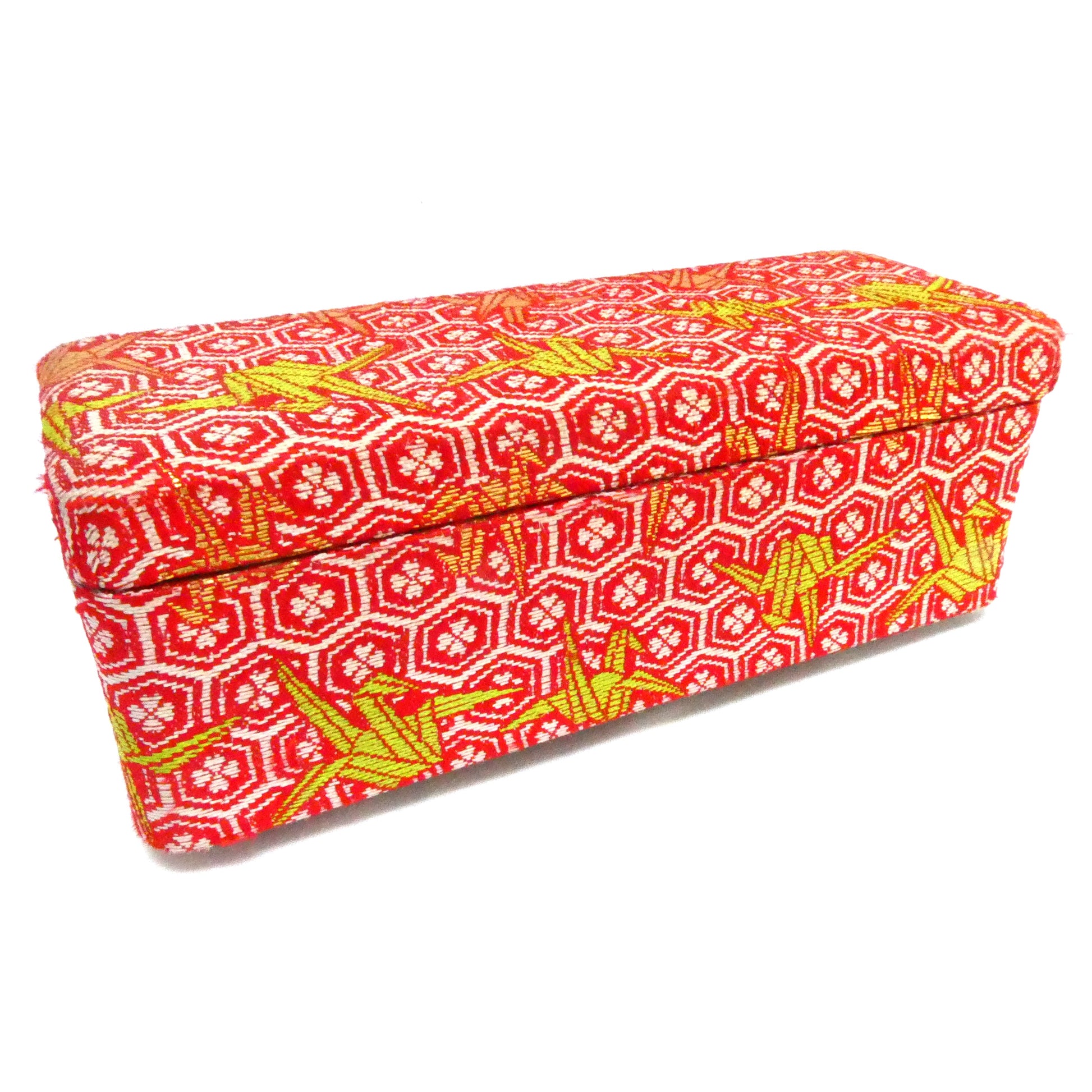 Japanese brocade fabric box or case with a red and gold geometric pattern and green origami crane designs. In Japanese culture, the crane (Tsuru) is a highly significant symbol associated with good fortune, longevity, loyalty, and peace. The tradition of folding one thousand origami cranes (senbazuru) is believed to grant a wish for health or a long life, a symbol popularized by the story of Sadako Sasaki, a child survivor of the Hiroshima atomic bombing.