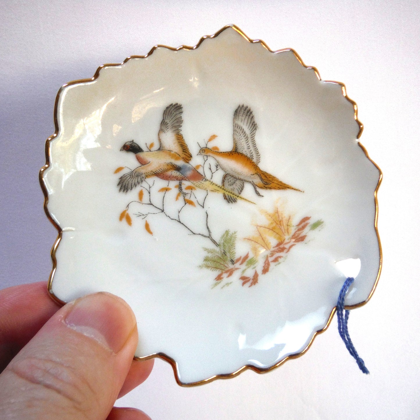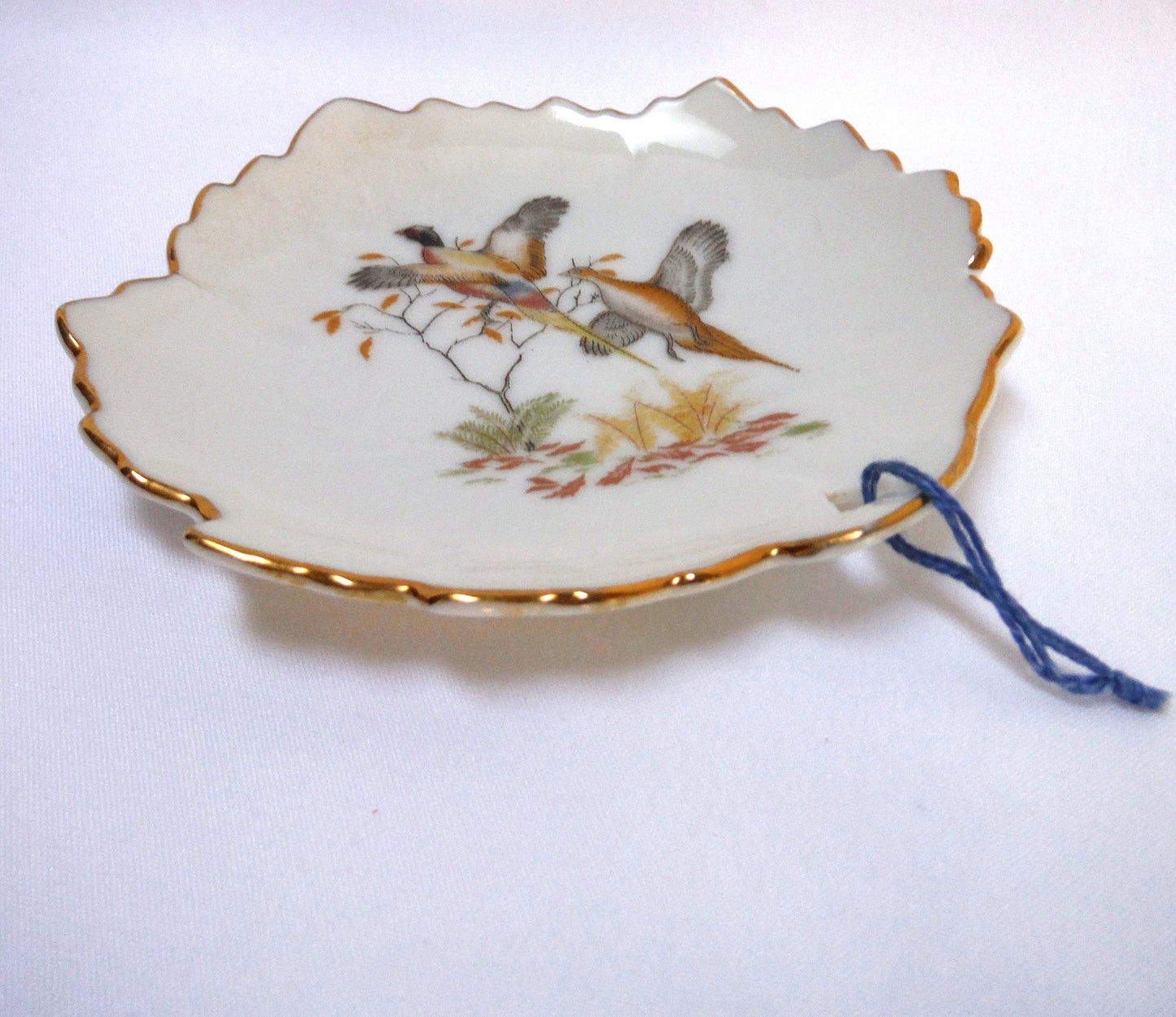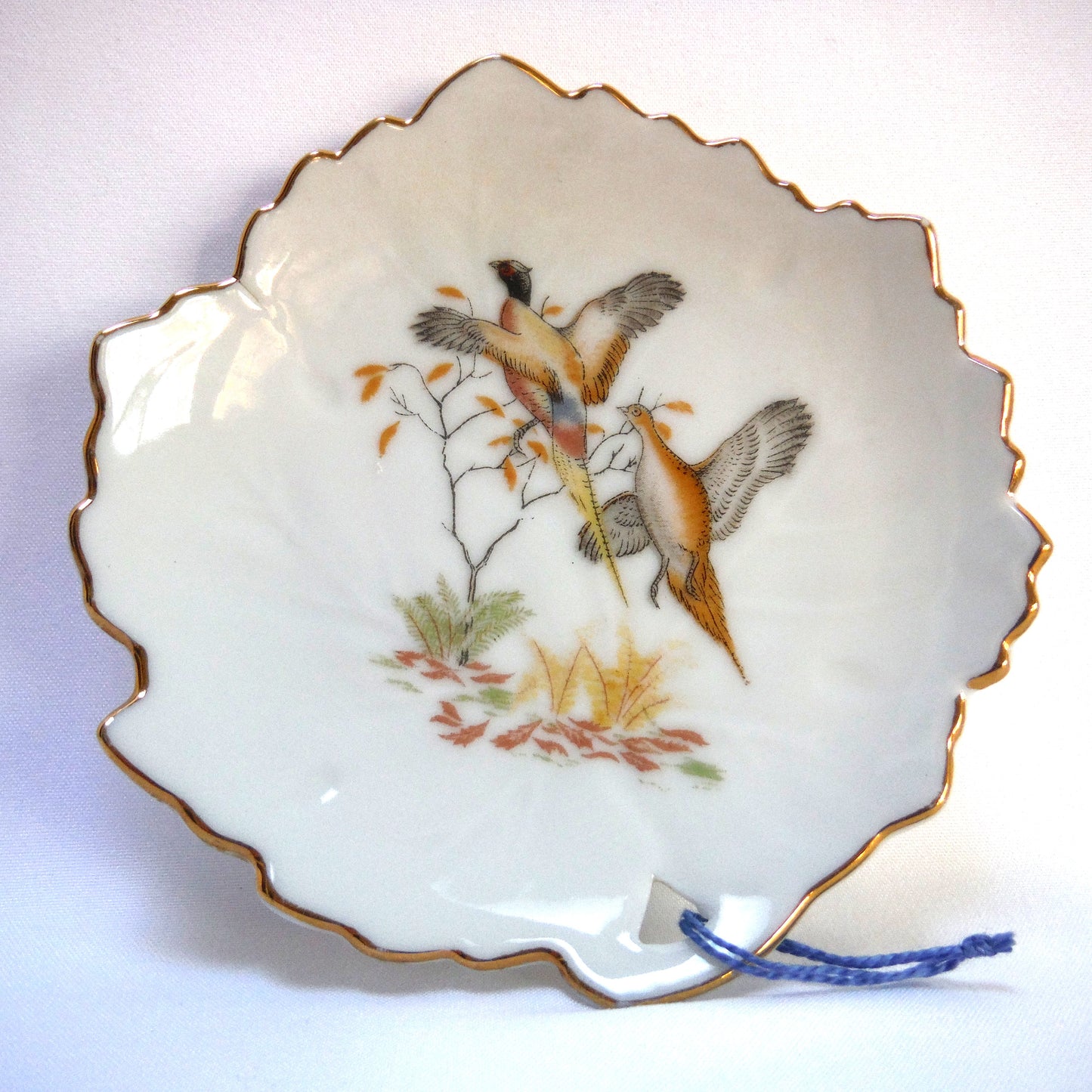 This Vintage Trinket Dish from JAPAN features the image of 'Two Pheasants Flying' in muted pastel colours, very reminiscent of the fall shoot. The string was on it when I collected it, but I don't know what it or the hole is for, do you? The condition is excellent, with no chips or cracks, and the gold trim is vibrant. The bottom features the manufacturers logo. Made in Japan.