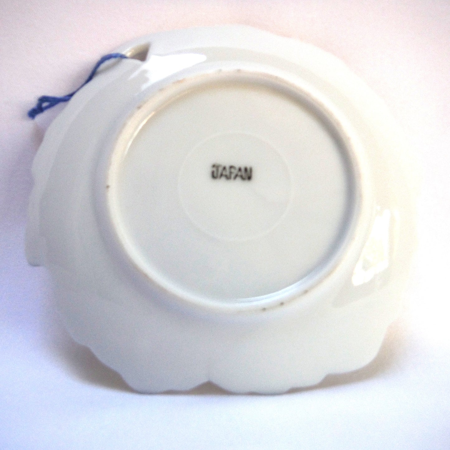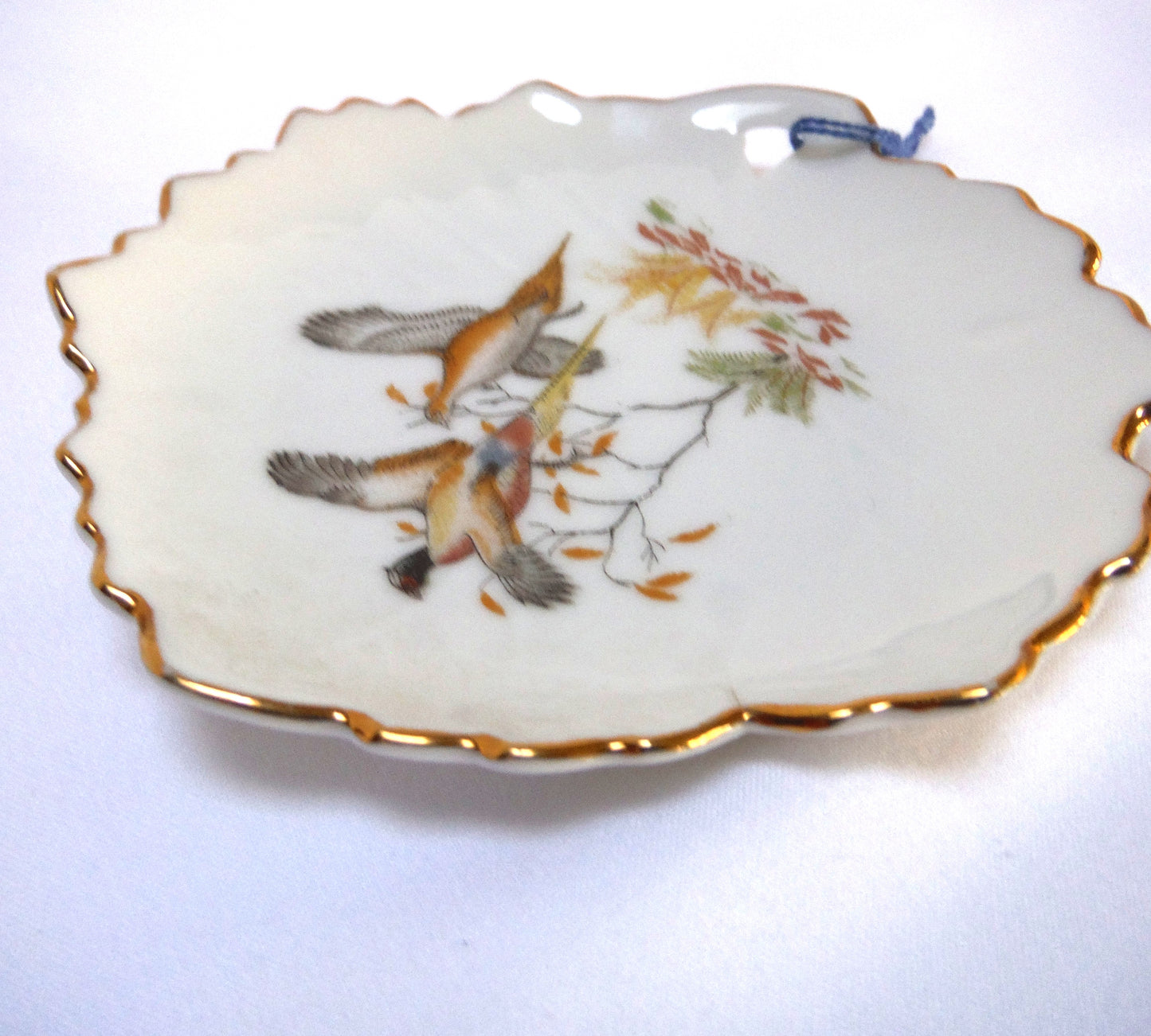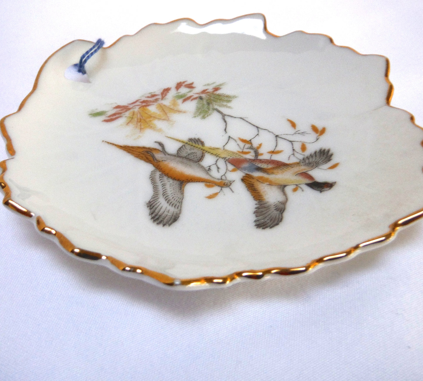 This Vintage Trinket Dish from JAPAN features the image of 'Two Pheasants Flying' in muted pastel colours, very reminiscent of the fall shoot. The string was on it when I collected it, but I don't know what it or the hole is for, do you? The condition is excellent, with no chips or cracks, and the gold trim is vibrant. The bottom features the manufacturers logo. Made in Japan.