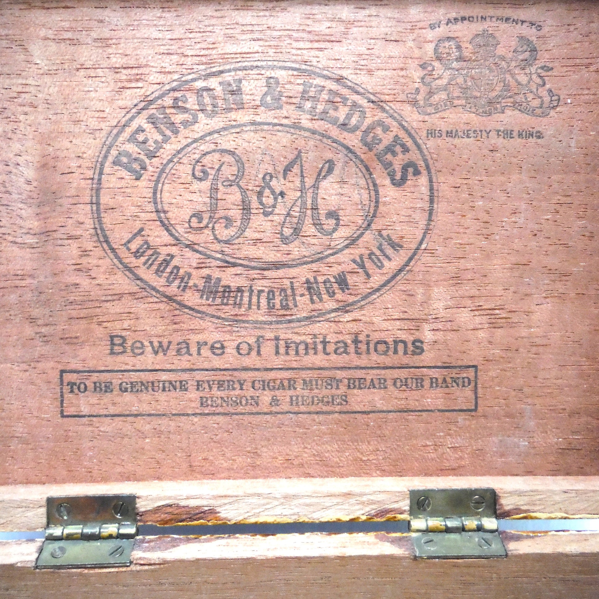 Vintage Wood Cigar Box with Hinged-Lid Working-Lock Humidor, 'INVINCIBLES DE BENSON AND HEDGES