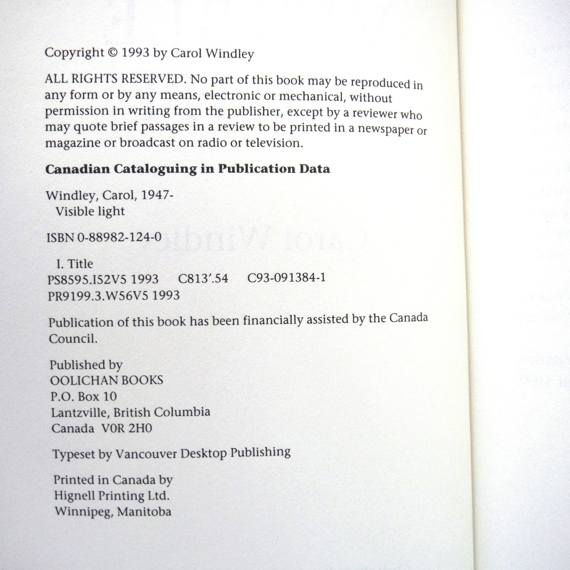 VISIBLE LIGHT, is Carol Windley's debut collection of short stories, lit with the grey lucency of British Columbia's west coast, where often the line between sky and water is nearly imperceptible, where memory and the eye are sometimes deluded into seeing just outside the range of ordinary light.