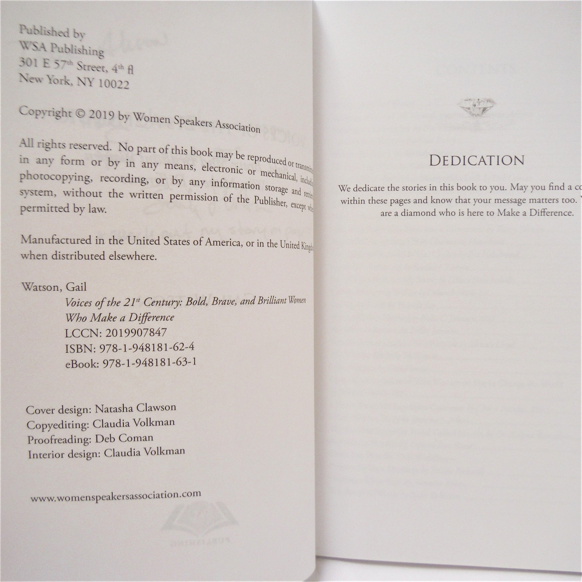 Voices of the 21st Century is co-authored by Gail Watson, Alexis Schomer, Allison Summers, Anita Russell, Barbara Barry, Carma Spence, Charmaine Hammond, Cheryl Peltekis, Deb Coman, Deborah Isis, Dee Dee Vicino, Desiree Aragon, Donna Rae Reese, Elaine Voci, Eva Hebebrand, Eydie Robinson, Felicia Rickards, Francine Tone, Gail Rosenthal, Irma Parone, JJ Conway, Jeannine Rivers, MissyJena, Johnnie Lloyd, Kalpna Ranadive, Kamini Wood, Kiley Doll, Laura Rubinstein, Laura Wayman, Lillian Diaz Imbelli, Lisa Wellington, Lorianne Vaughn Speaks, Lynn Robinson, Mary Wong, Melody Breyer Grell, Michelle McKinnie, Nasrin Barbic, Natasha Clawson, Nelie Johnson, Paige Wilhide, Pamela Jay, Sandy Horton, Shalanda Wilder, Shawna Pelton, Sheena Watson, Sirena Pellarolo, Susan Thomas, Tami Damian, Terry Sidford, Tracey Ehman, and Trilby Johnson.