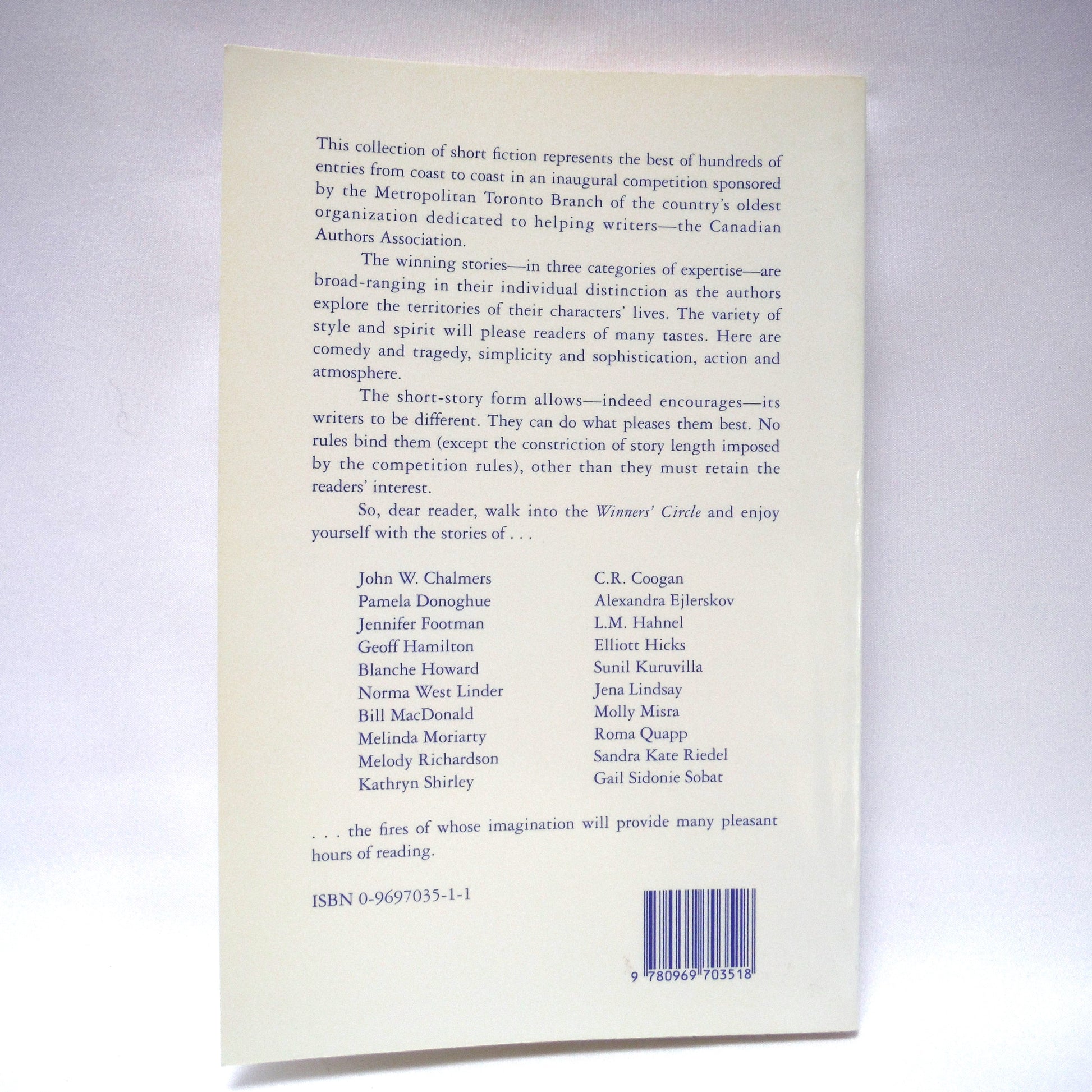 WINNERS CIRCLE, is a collection of winning entries from the Canadian Authors Association Metropolitan Toronto Branch second annual short story competition held in 1994.