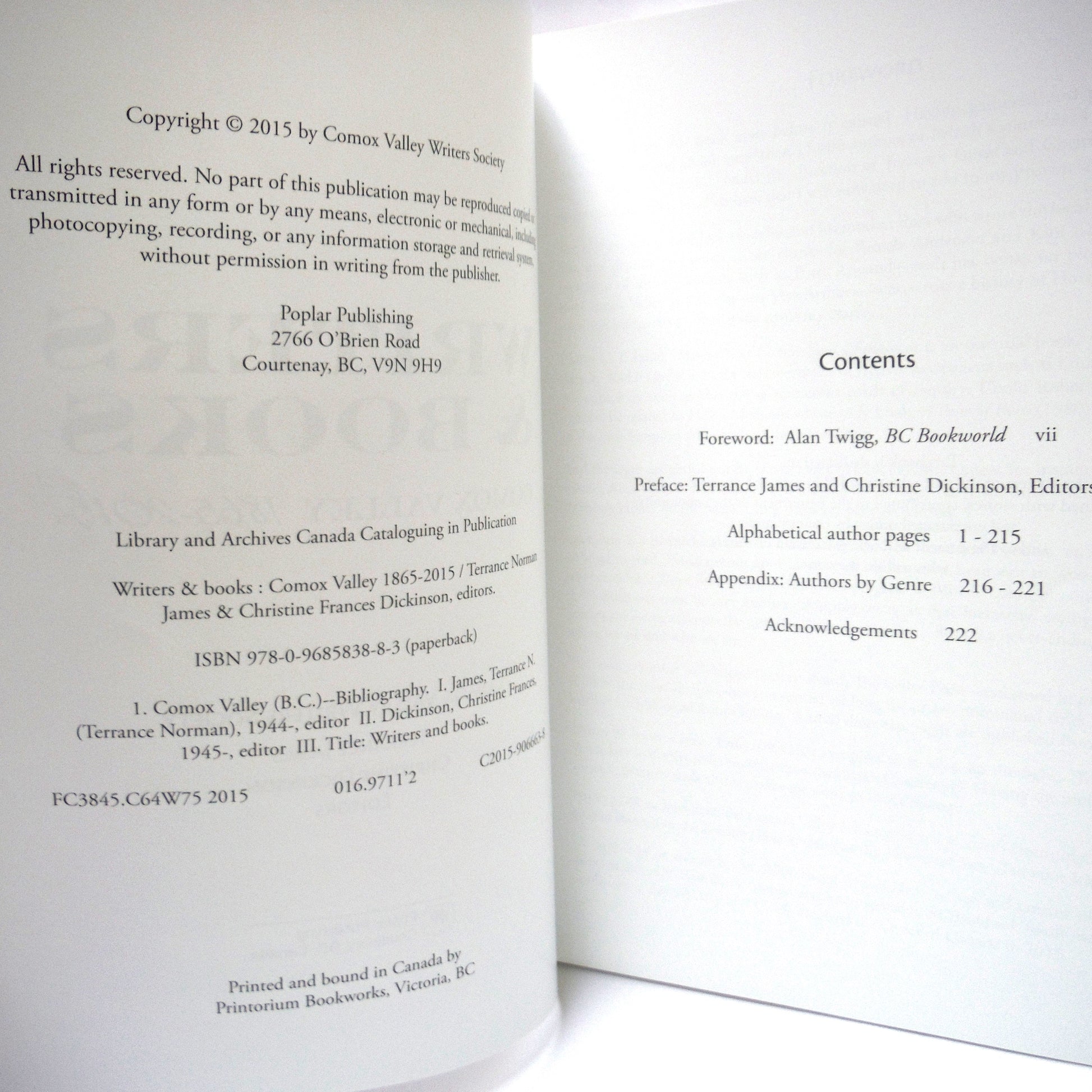 Author: Various. Edited by Terrance James and Christine Dickinson. Published by Poplar Publishing, Courtenay, BC., 2015, 1st Edition. Printed in Canada. Almost New Condition SOFTCOVER Book, with light cover wear. Clean inside, tight spine. Size:10 x 8 inch, 222 pages including index.